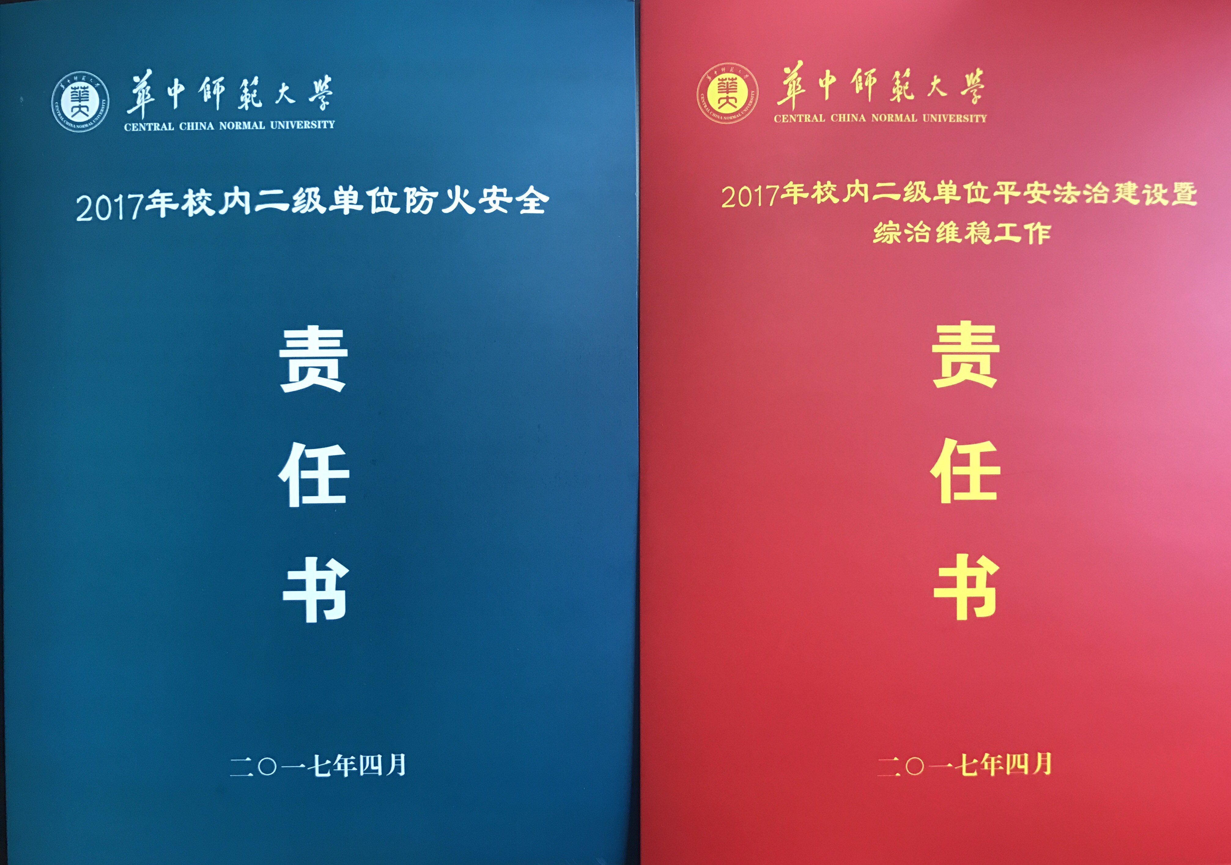 在学校办和保卫处组织下,已完成学校党政主要领导与69家二级单位主要负责人签订《2017年校内二级单位防火安全责任书》和《2017年校内二级单位平安法治建设暨综治维稳工作责任书》的工作,为进一步夯实我校“党委总揽全局,办公室组织协调,职能部门各司其职,师生员工全员参与、齐抓共管,群防群治”的安全工作格局奠定了坚实基础。