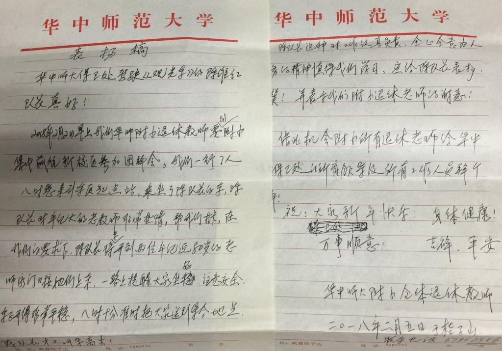 信中说到:保卫处校车的陈维红队长负责将准备去新校区参加团拜会的华师附小7位退休教师送往附小门前集合点。陈队长在8点钟准时到起点处等候教师,并且考虑到有两名将近80岁的退休教师行动不便,提前到达教师家门口把他们接上车。开车途中,陈队长更是敬业贴心,再三叮嘱每位教师抓牢坐稳,一路平稳地将教师准时送到集合地点。附小退休教师们提出应学习保卫处职工全心全意为人民服务的精神,并对陈队长认真负责,热心服务的工作表示由衷的谢意。