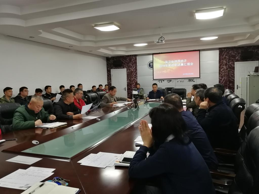 4月28日下午,保卫处召开领导班子和中层领导干部2018年度述职述廉考核大会,会议由保卫处处长王东爽主持,保卫处全体职工参加。