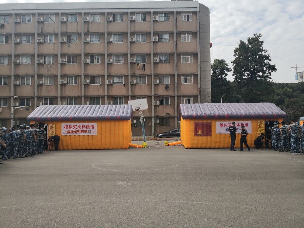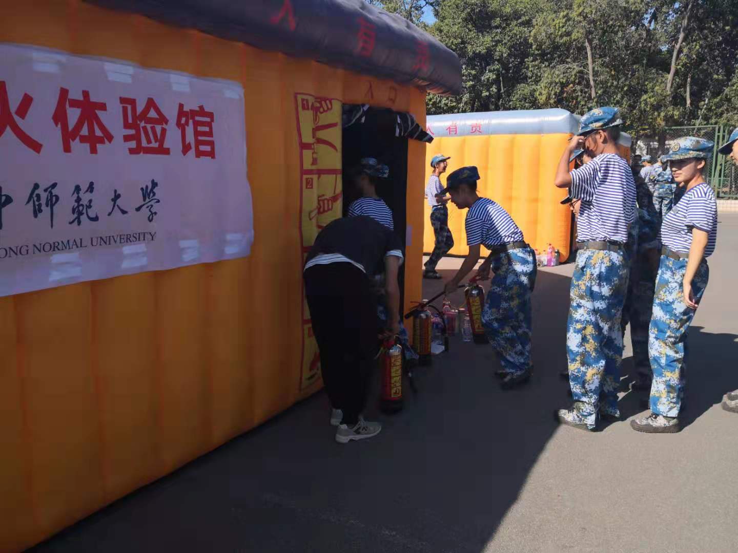 同时,保卫处创新消防演练体验模式,在9月20日、21日组织全体军训新生开展了为期两天一晚的“模拟烟雾应急疏散逃生演练和模拟灭火器灭火”的实操实训体验活动。“模拟灭火”主要是利用“声光电”技术,高仿真模拟火灾现场,操作人员运用电子灭火器模拟灭火,循环利用、无污染;“模拟逃生”主要是运用现场设置的逃生帐篷再现火灾突发时的烟雾场景,体验者根据帐篷内的指示标志“弯腰、低姿、捂口鼻”进行迅速有序的逃生。