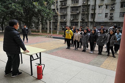 理论知识讲解完成后,保卫处的易老师向助理们展示了灭火器以及消防栓的使用方法。在灭火器的使用中,他强调了要检查压力表是否处于绿色正常区域这一问题,并用“摇一摇,放地上,拔销子,拉管子、压靶子”的口诀总结了使用灭火器的方法和过程。而在演示消防栓的使用时,他主要讲解了消防水带的连接方法,并强调了两人使用消防栓的分工技巧。