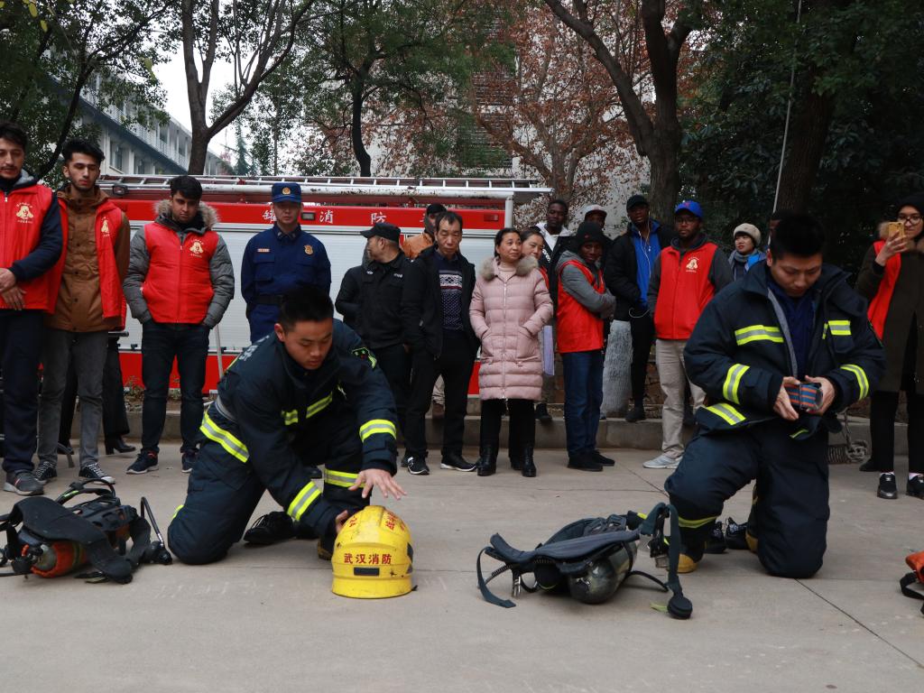 为加强国际学生消防安全教育意识,帮助学生进一步了解火灾疏散流程,2019年12月20日下午,我校留学生管理工作办公室联合保卫处、武汉市消防支队洪山区卓刀泉中队在国际园区操场举行“关爱自己,尊重他人”系列活动之“消防疏散演练”主题活动,武汉市消防支队洪山区卓刀泉中队副队长郭子浩、华中师范大学保卫处副处长李丹、国际文化交流学院党总支书记王琍、院长佐斌、副院长孙焱、副院长万莹等领导出席。国际文化交流学院全体教职工、200余名国际学生参与了主题活动。