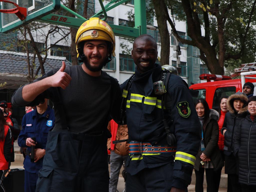 通过消防战士的讲解,国际学生不仅了解到消防栓的使用、灭火服的穿戴以及灭火器的使用等基本消防知识,观摩了消防战士的示范动作,还踊跃报名,切身体验了操作消防栓,穿戴灭火服,使用灭火器等实际操作。