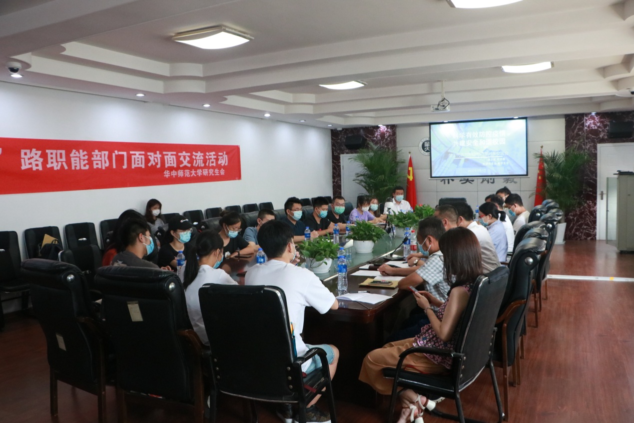 2020年9月1日下午,由保卫部(处)、校团委、校研究生会、校学生会共同开展的“科学有效防控疫情,共建安全和谐校园”职能部门面对面交流活动在保卫处三楼会议室举行。16名学生代表与保卫部(处)长王东爽、副部(处)长李丹、黄凯以及各中心(办公室)主任进行面对面交流。