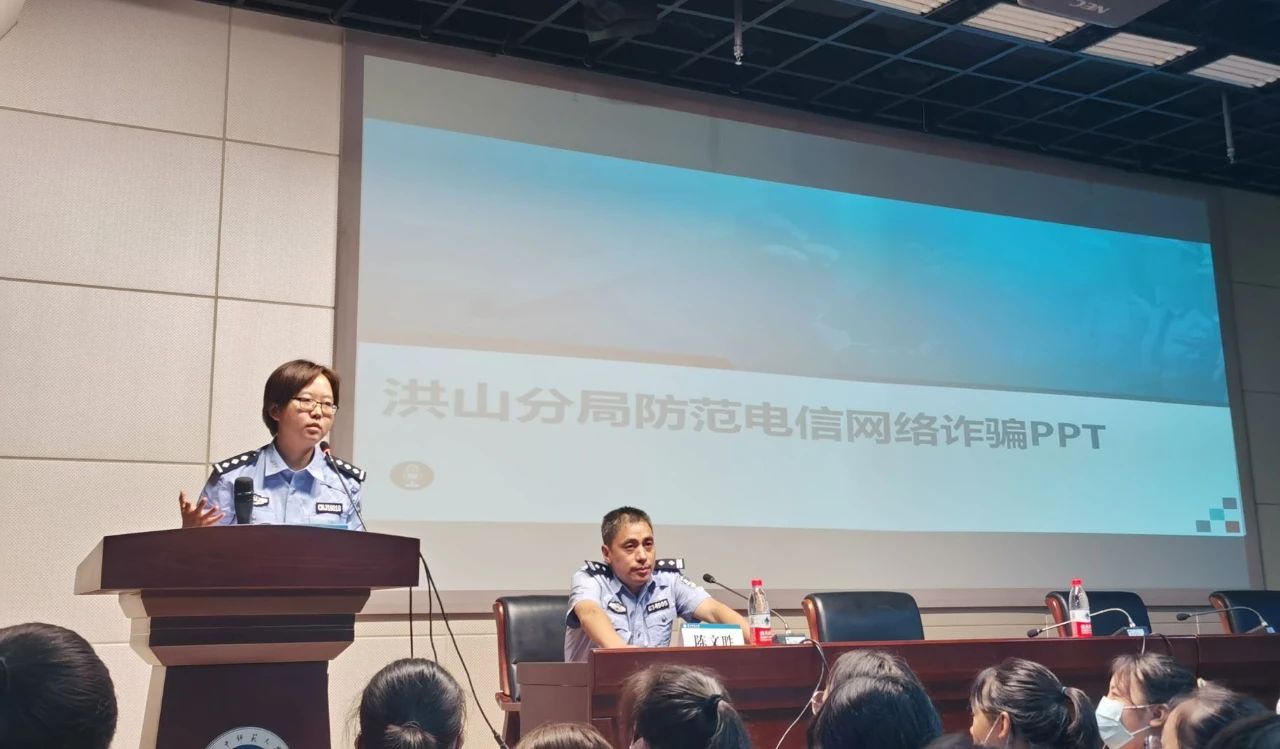 讲座由洪山分局马房山派出所陈文胜所长和刘文涓警官主讲,陈文胜所长结合自身办案经历,深入浅出地介绍了一些基本的安全防诈骗知识;刘文涓警官结合一起跨国电信网络诈骗案件,揭示了网络诈骗的危害:负债累累,人财两空。紧接着,她从电信诈骗、网络刷单诈骗等八个方面详细介绍了如何树立反诈骗意识,并提醒大家将生命和财产安全放在首位,不抱“赌徒”心理,如已被骗,及时止损,不贪小财不借高贷。