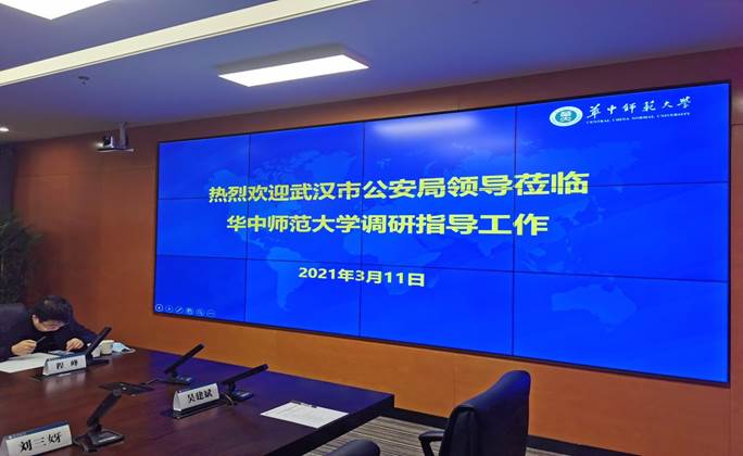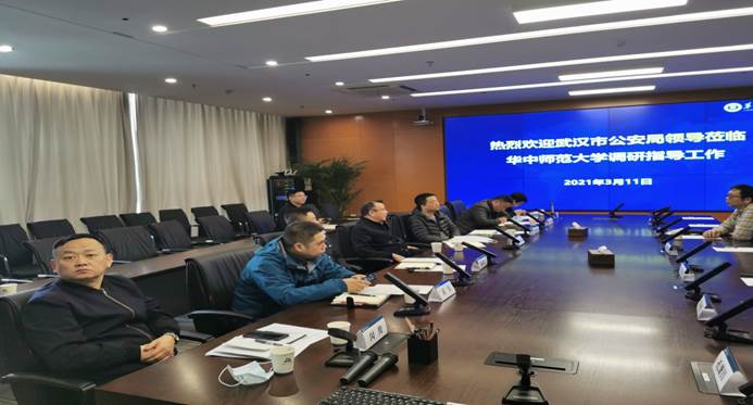 为响应国家号召,服务国家战略,为地方经济社会发展提供支撑,让人工智能和大数据方面的科研力量有效地为地方服务,武汉市公安局领导于2021年3月11日下午14点30分在我校南湖综合楼11楼1182室进行了调研指导工作。此次调研座谈会议由副校长彭南生主持。