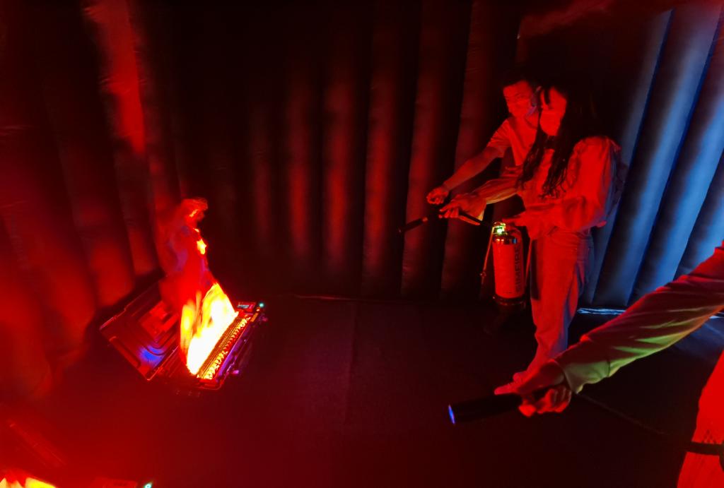 演练分为灭火器构造以及使用和学习模拟火灾逃生救灾两个部分。