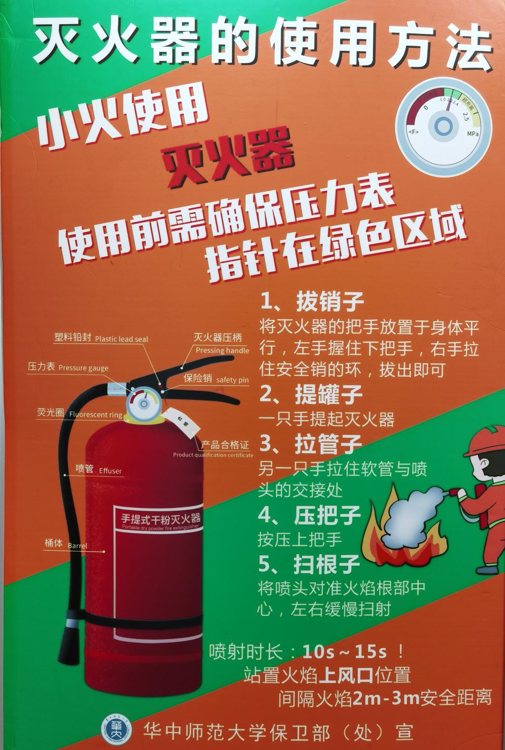 首先由保卫部(处)老师为学生讲解灭火器构造以及使用方法:灭火器由筒体、器头、喷嘴等部件组成,借助驱动压力将所充装的灭火器喷出,达到灭火的目的,灭火器由于结构简单,操作方便,轻便灵活,适用面广,是期火灾的重要消防器材。灭火器使用方法如下:扑灭初