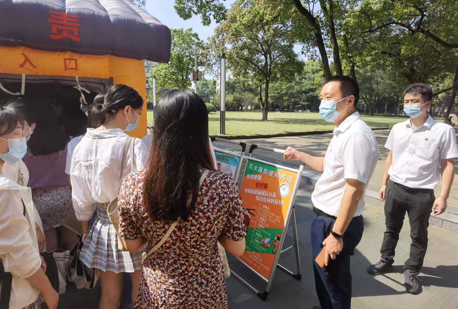 为了营造一个安全、稳定、和谐的校园环境,增强校内人员消防安全意识,提高紧急逃生能力。华中师范大学保卫部(处)分别于9月18日和9月28日在博雅广场、9月29日和9月30日在南湖综合楼二楼大厅、9月10日在化学楼前,对数统学院、物理学院、生科院、经管学院、信管学院、体育学院、人工智能学部,化学学院,文学院,外国语学院,公共管理学院,心理学院,伍伦贡学院,计算机学院的新生们开展了共计5200余人次的消防逃生模拟演练与灭火模拟演练。