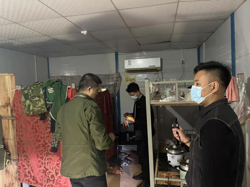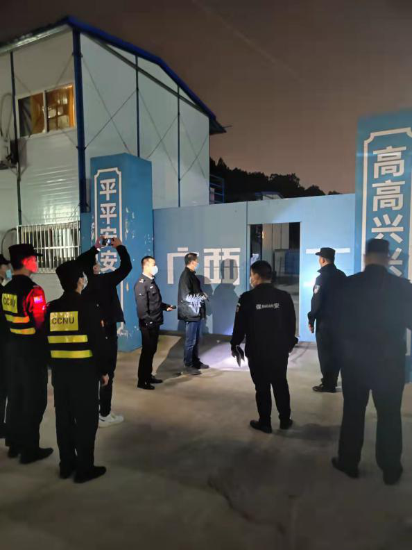 保卫部(处)联合辖区公安对校内中联建工、广西建工、湖南四建、永和建设、中至信集团、沁园春工地、孵化器工地、环山东路物业公司聚居点等农民工聚居场所开展治安消防安全突击检查,清查人员身份信息,收缴违禁物品,要求校内工地人员遵纪守法、规范自身言行,树立安全无小事,责任重于山的安全意识,并对三家单位下达限期治安隐患整改通知书。