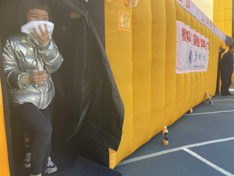 保卫部(处)专业人员在操场上搭建“模拟烟雾体验馆”,同学们在消防员和老师的组织下有序地进入体验馆,大家用湿毛巾捂住口鼻,弯腰前行,依次进行逃生。