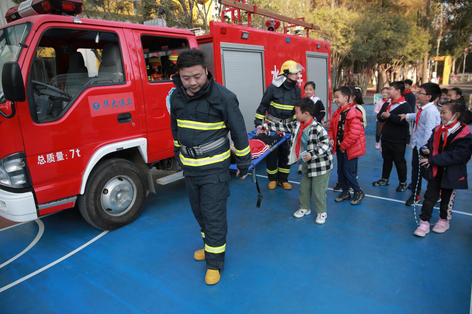 消防员与同学们配合开展紧急救护演习,让同学们知道了如果身边有人受伤时该如何正确处理以及寻求帮助。