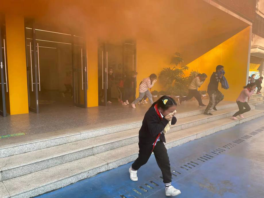 当模拟火灾的烟雾弥漫教学楼时,消防警报迅速拉响,各班学生快速拿出湿毛巾捂住口鼻,在老师的带领下排好队,迅速、有序地从教室撤离,在短短的四分三十秒之内,全校学生在老师的带领下全部顺利撤离至操场,此次演练也让同学们有了一次较为真实的感受,以便应对生活中真实的火灾危险。