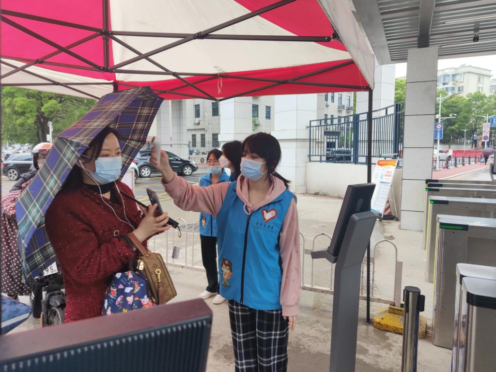 志愿者身穿蓝马甲值守校区各大门口