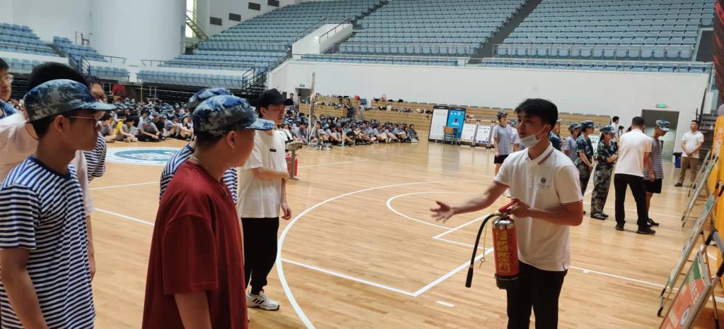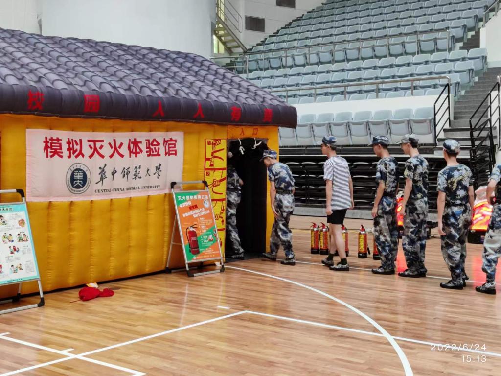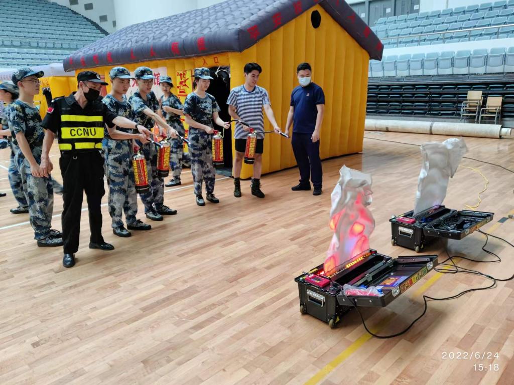 6月24日,我校保卫部(处)邀请洪山区公安分局民警为正在开展军训的2021级本科生进行了反诈安全、消防安全科普教育,并带领军训学员分连队开展消防模拟灭火与逃生演练活动。洪山区公安分局人口大队民警张珏菡向同学们讲解反诈知识,并借助互动问答环节向同学们详细介绍了“国家反诈中心”APP的详细功能和使用方法,提醒同学们时刻注意防诈骗。洪山消防大队消防专员随后向学生们讲授消防灭火知识,并示范了如何规范正确使用灭火器。在场同学认真学习了查看压力表、拔出保险插销、握住管口、按压开关等一系列灭火动作要领,并随后有序排队体验灭火、逃生模拟演练,在亲身体验中情景式学习灭火和逃生的方法和技巧。九连的郭雅婧同学表示,很难得亲身感受并学习灭火和逃生方法,警官们的讲解细致、示范清晰,并能在随后的模拟体验中做到“知行合一”。