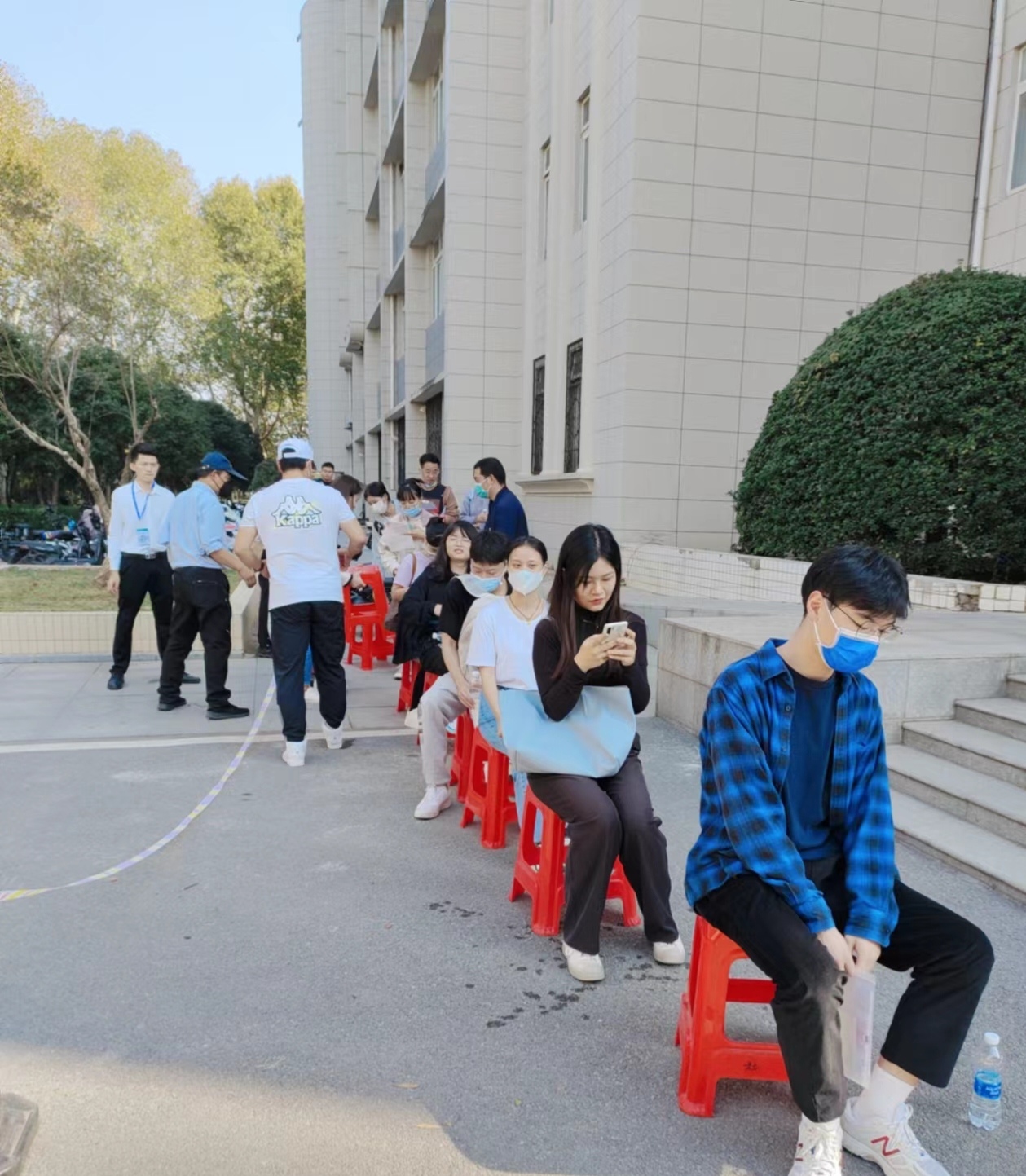 保卫部工作人员维护现场秩序,同学们有序排队。