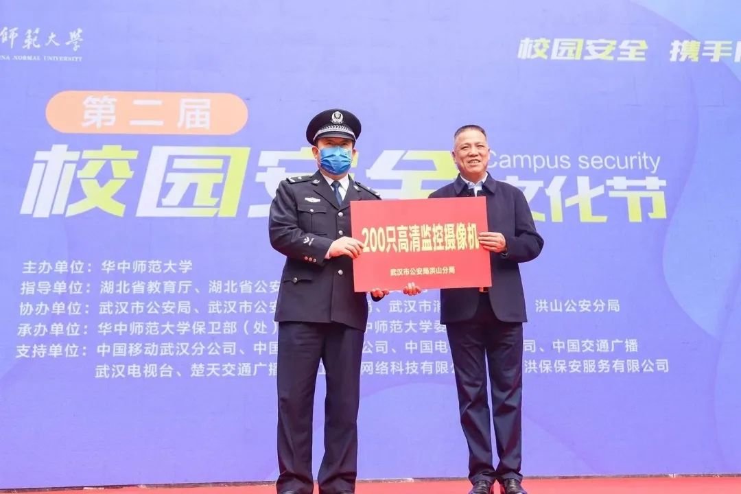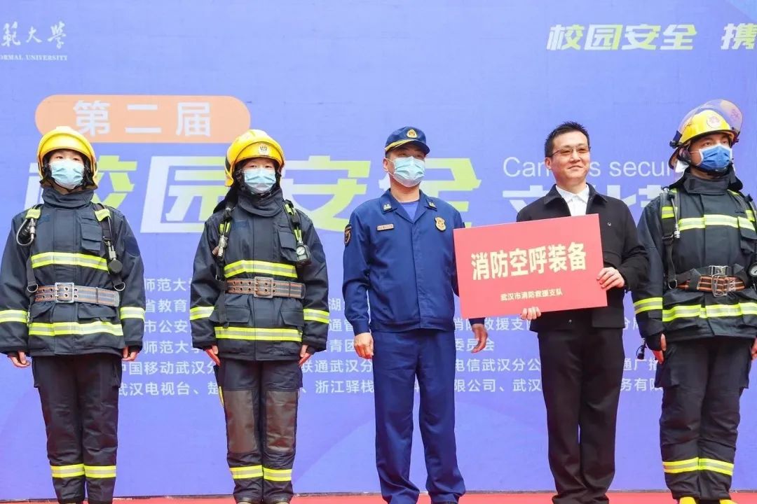 活动现场,武汉市公安局交通管理局为学校赠送了100顶安全头盔,武汉市消防救援支队为学校赠送了5套消防空呼装备,洪山公安分局为学校赠送了200个高清监控摄像机。