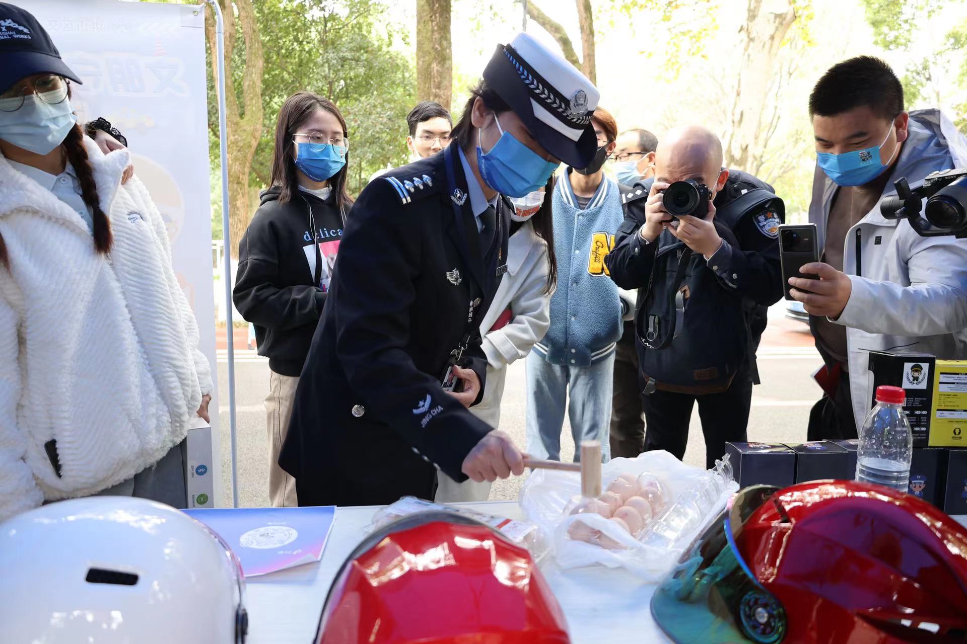 华中师范大学校园面积大,坡道多,电动自行车成为不少学生的出行工具。通过对比实验,民警向师生们详细介绍了骑行电动自行车佩戴头盔的必要性,以及普通头盔和“3C”认证头盔的区别。