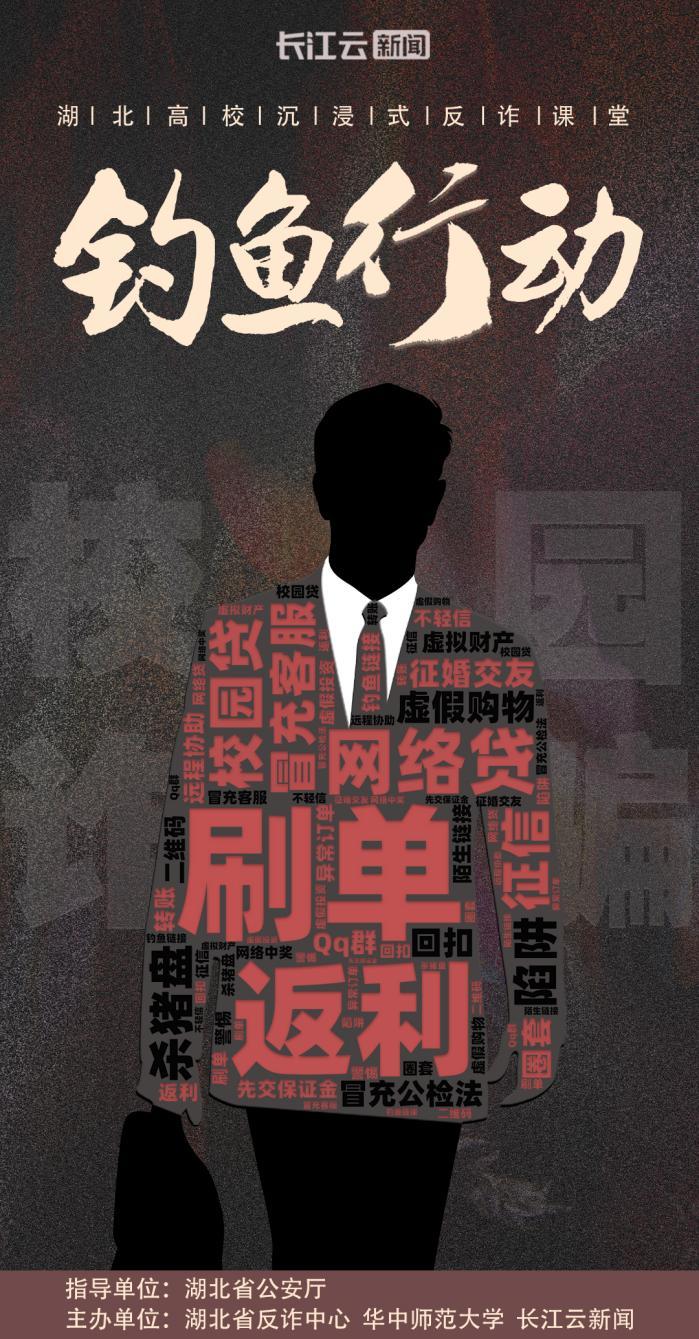 “钓鱼”行动开始!为增强湖北高校师生反诈意识,切实提高师生反诈技能,在湖北省公安厅的指导下,由湖北省反诈中心、华中师范大学、长江云新闻客户端联合发起的代号为“钓鱼”的沉浸式反诈课堂活动9月12日正式启动。