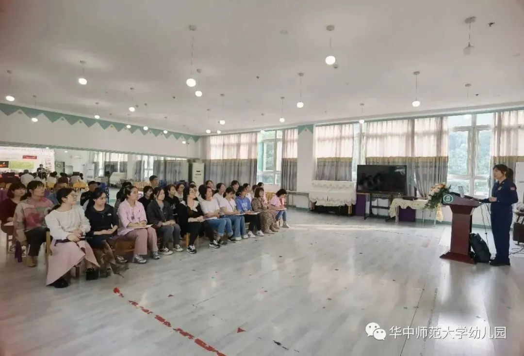 洪山区消防救援大队黄玲警官首先分享了几个典型火灾案例,用实例告诉大家如何防范于未然。并从学校防火须知、火灾扑救方法、火灾逃生技巧与消防法律法规等方面对教职员工进行了全面系统的指导。