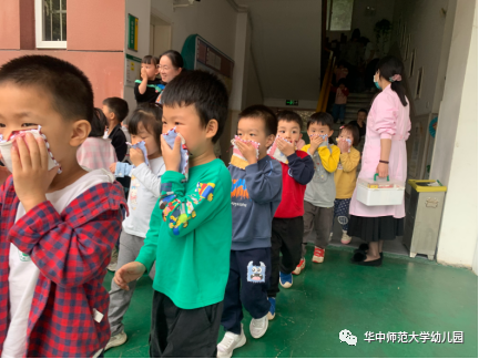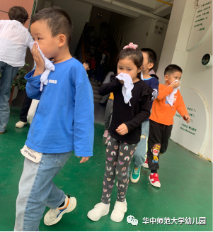 疏散演练过程中,全园师生有条不紊、衔接连贯,按消防预案的疏散线路有序带领幼儿拿起湿毛巾,捂住口鼻,弯腰小步快走,分三道楼梯迅速且有序下楼。到达幼儿园空地安全区域后,各班班主任清点人数,层层上报,确保不漏一人,最终由保教主任杨艳将情况汇总到幼儿园应急领导小组。