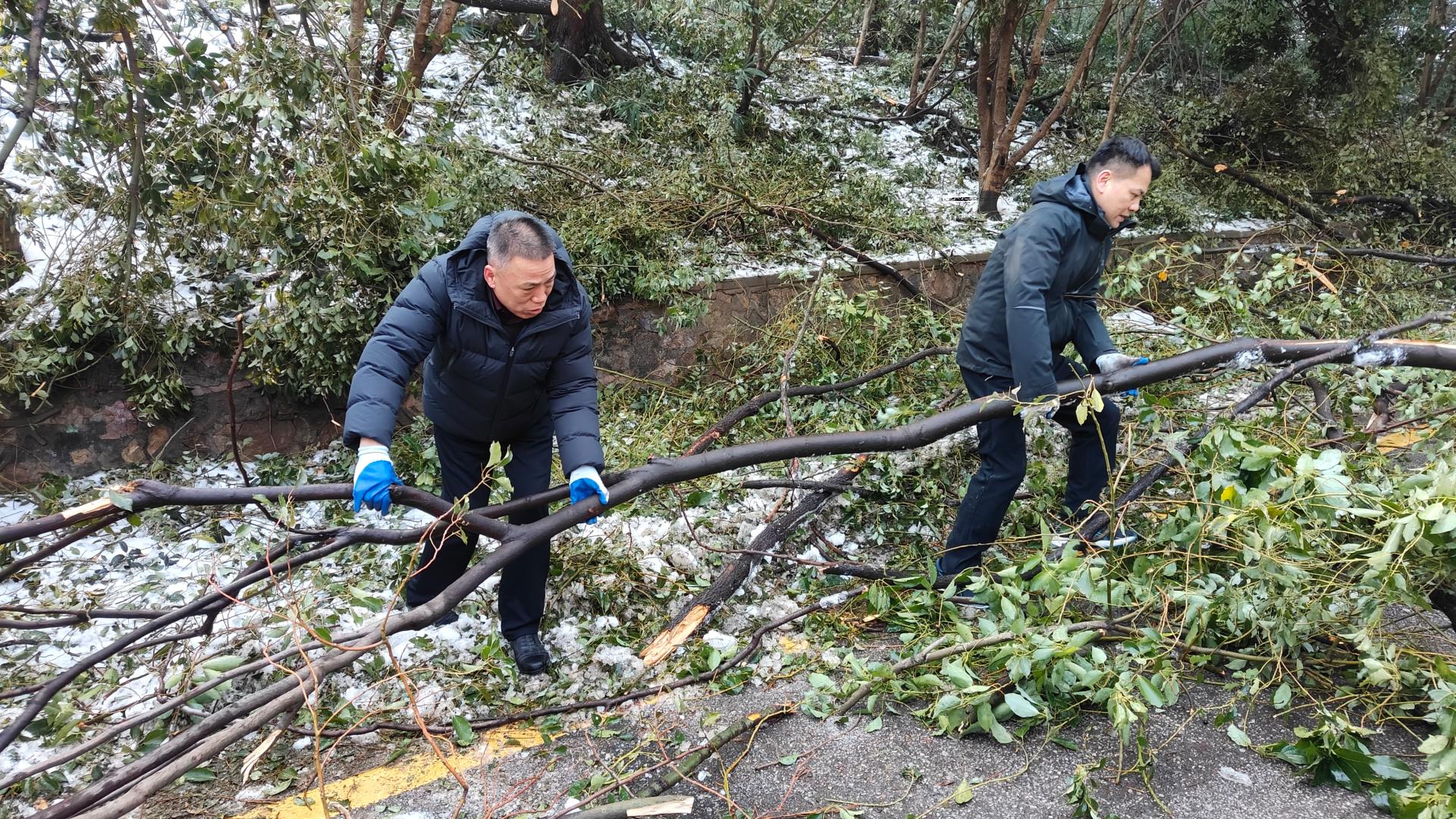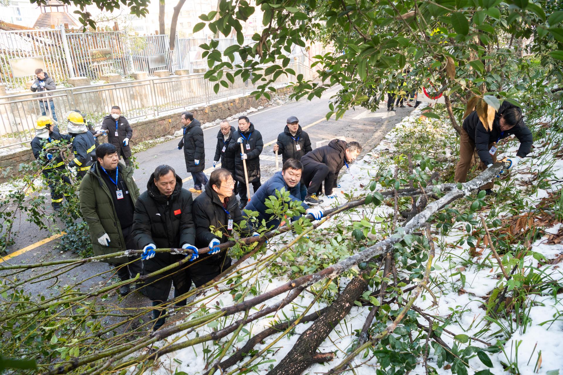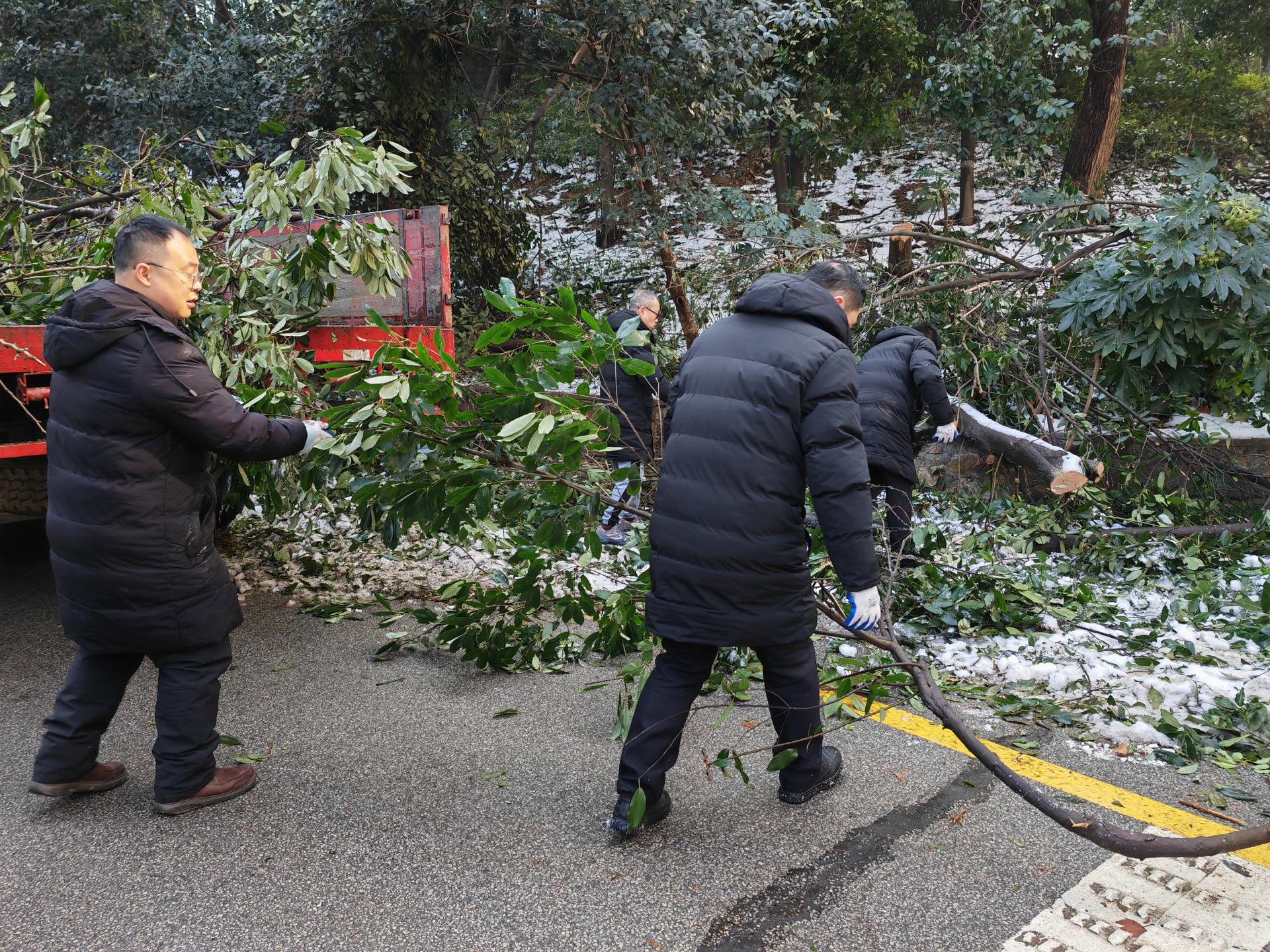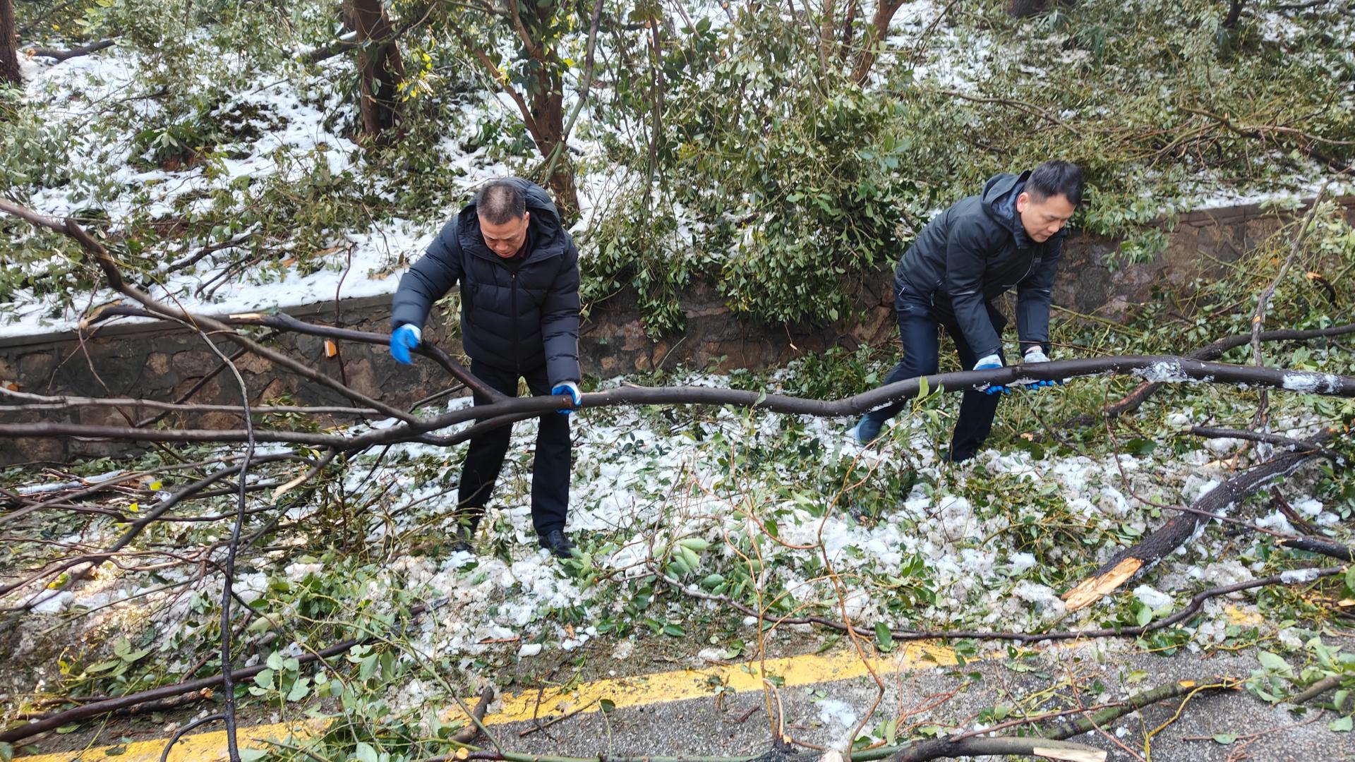 校党委副书记刘继文、保卫部(处)长王东爽冲锋在前,发挥党员先锋模范作用,带领大家清扫树枝。树上的冰渣还在持续掉落,却挡不住保卫人冲锋向前的脚步,现场一片火热和激情。大家在一声声加油鼓劲的呼喊声中,一齐把倒在路上的树干锯断,拖到路边,再将树干、树枝运上卡车拖走。