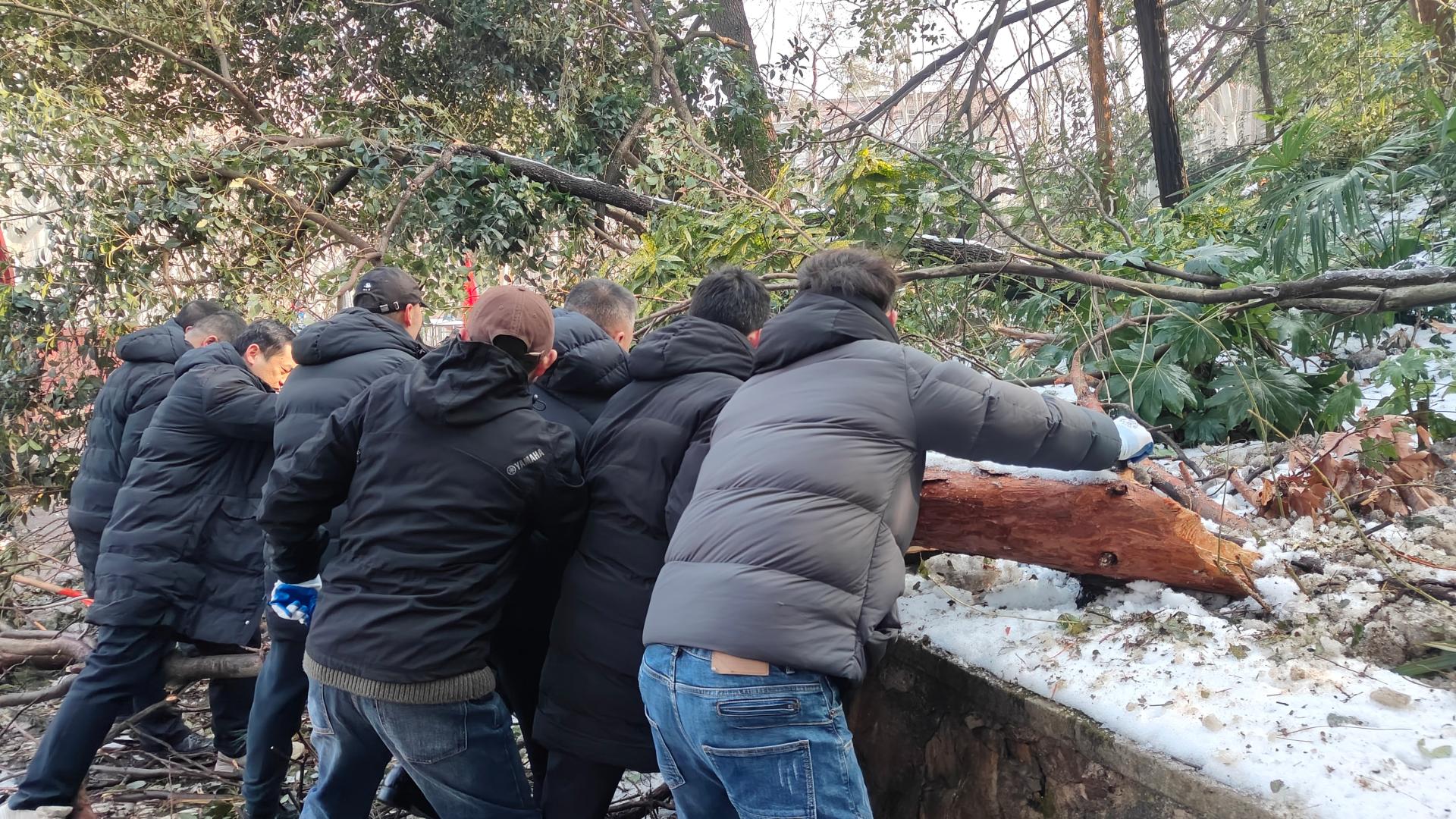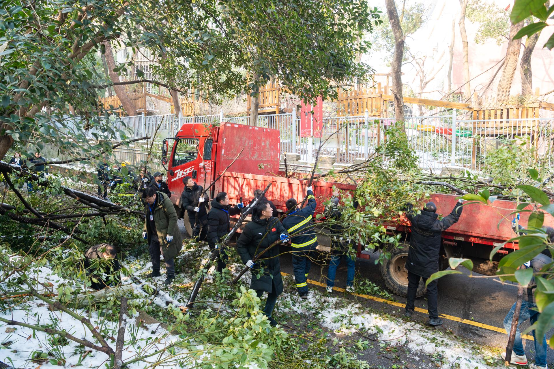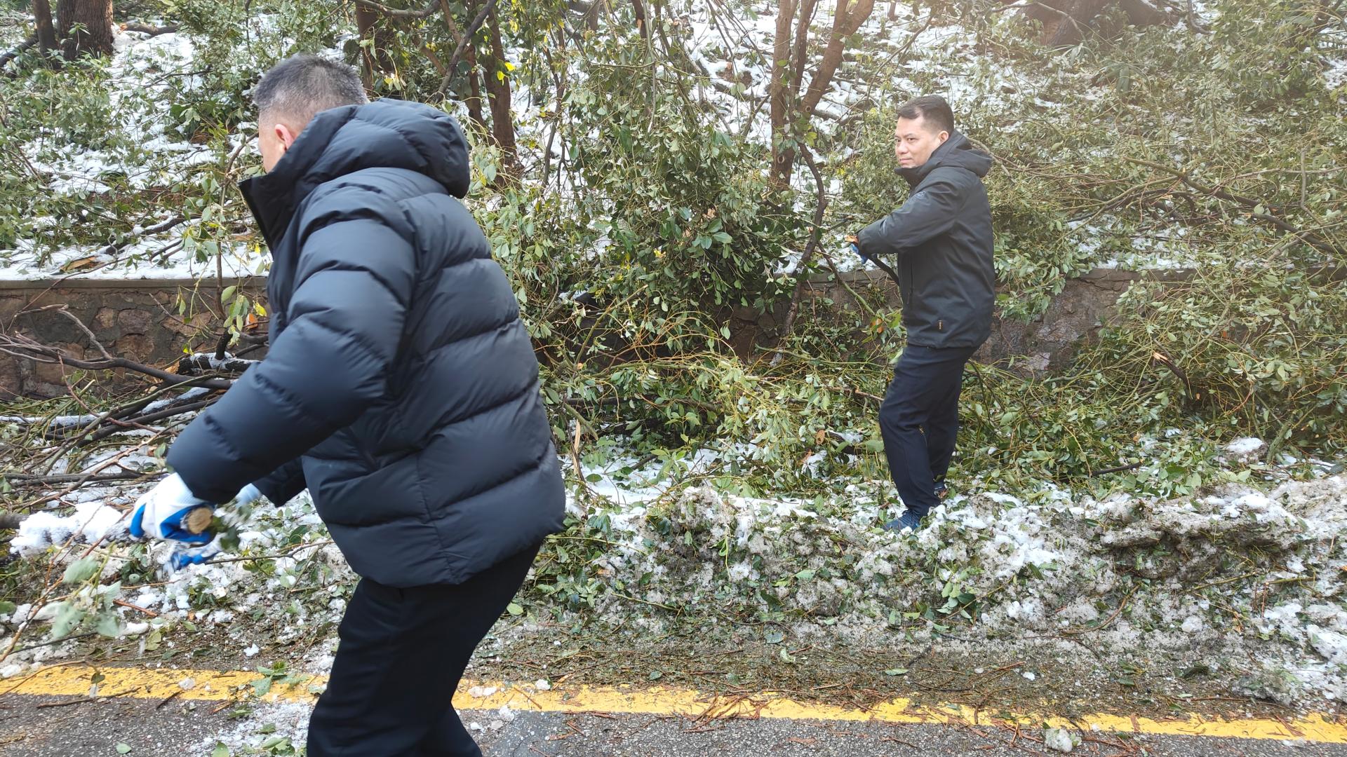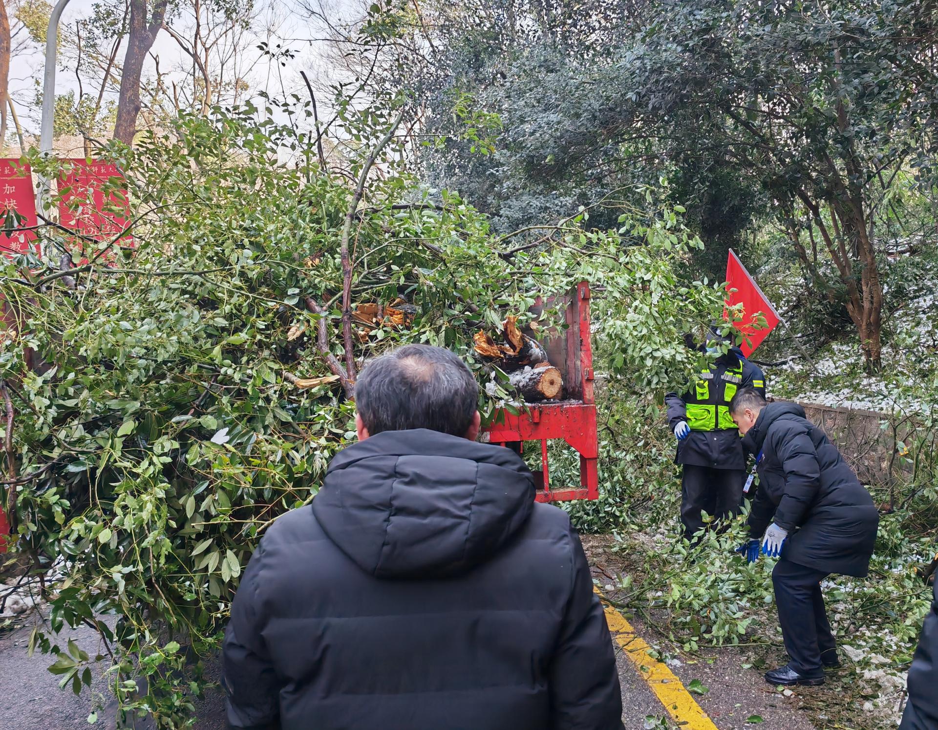 校党委副书记刘继文、保卫部(处)长王东爽冲锋在前,发挥党员先锋模范作用,带领大家清扫树枝。树上的冰渣还在持续掉落,却挡不住保卫人冲锋向前的脚步,现场一片火热和激情。大家在一声声加油鼓劲的呼喊声中,一齐把倒在路上的树干锯断,拖到路边,再将树干、树枝运上卡车拖走。