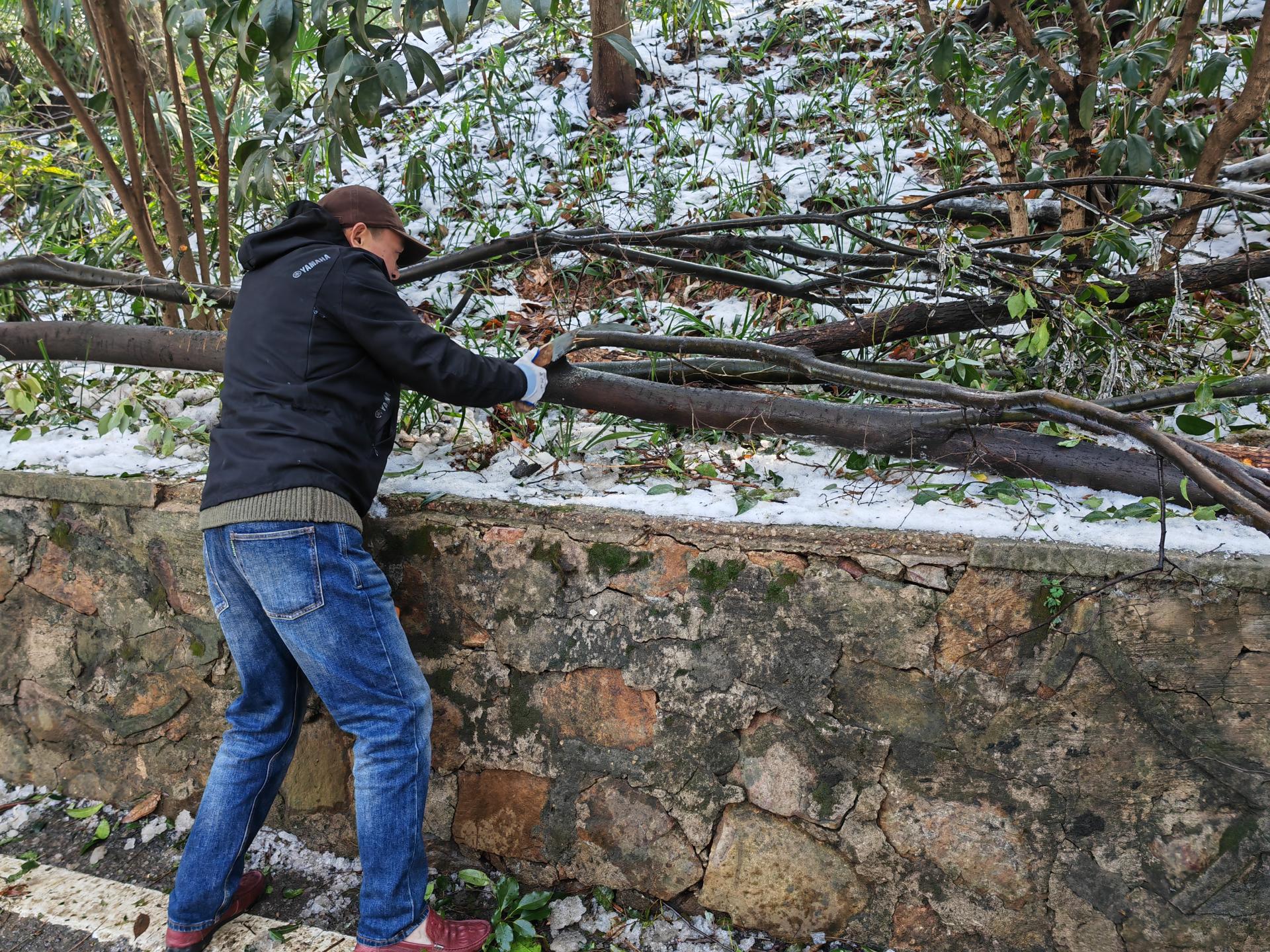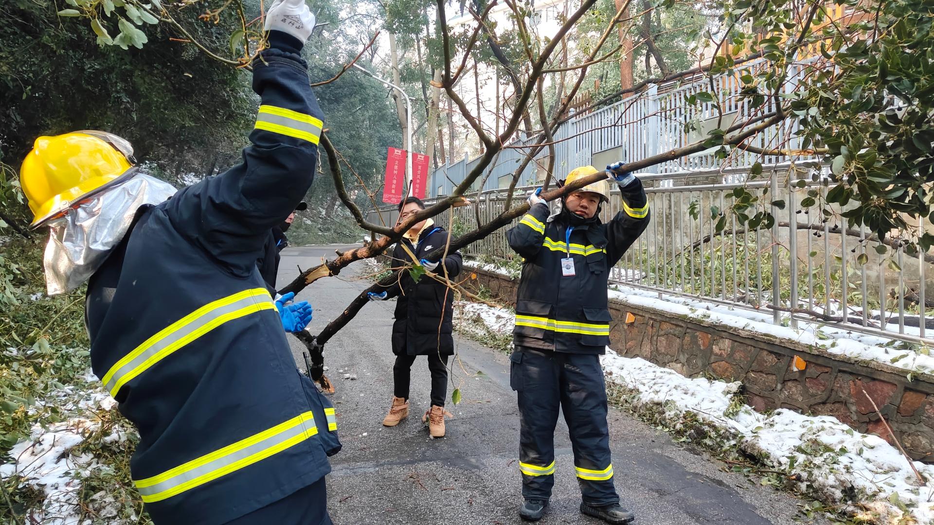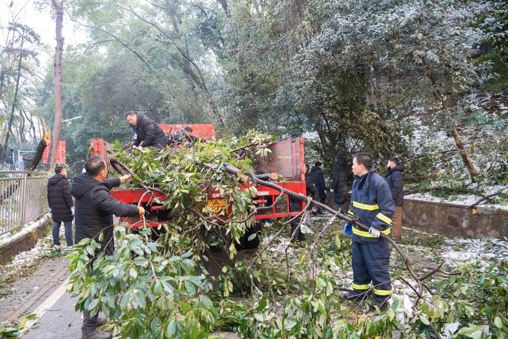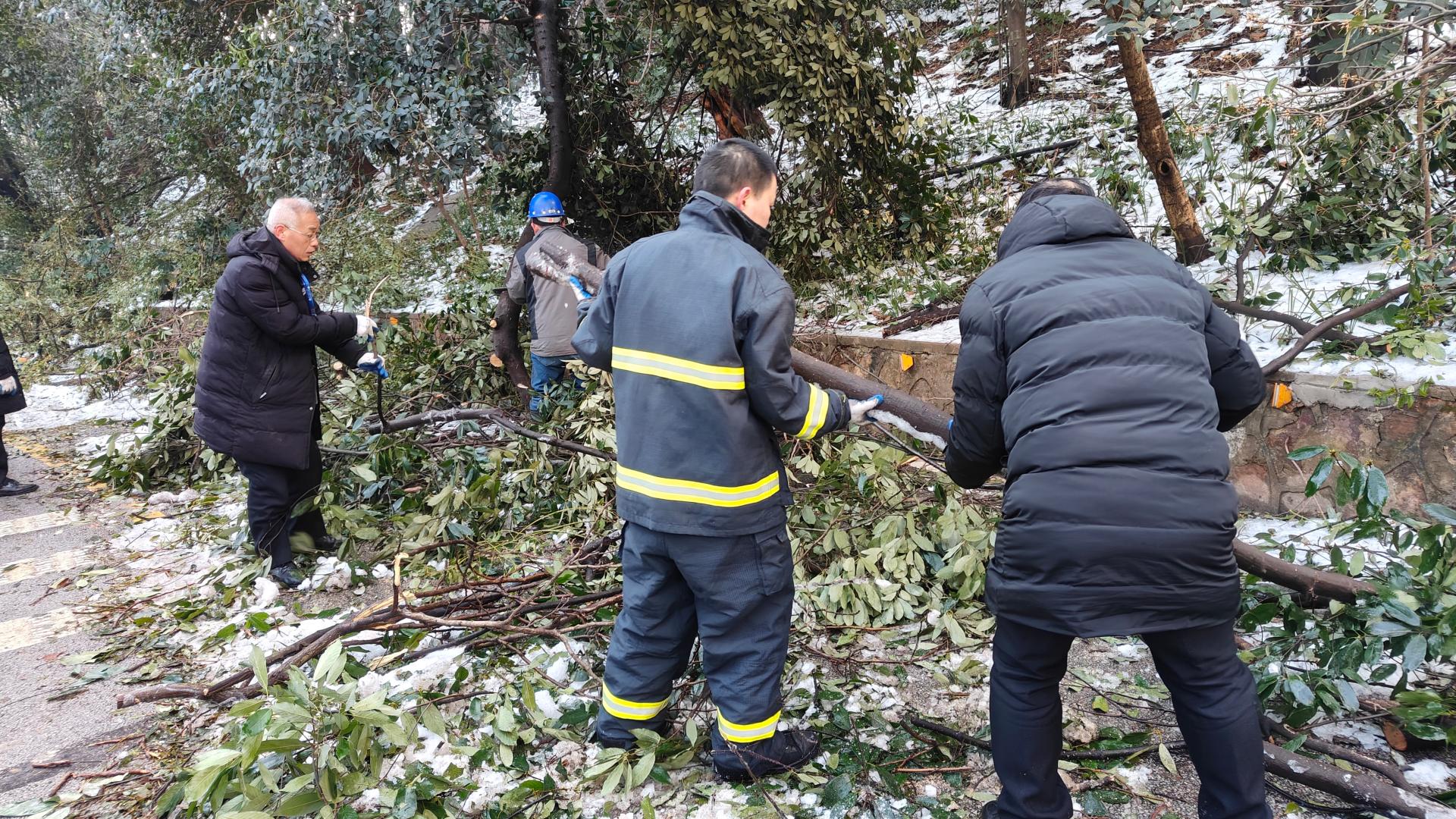 校党委副书记刘继文、保卫部(处)长王东爽冲锋在前,发挥党员先锋模范作用,带领大家清扫树枝。树上的冰渣还在持续掉落,却挡不住保卫人冲锋向前的脚步,现场一片火热和激情。大家在一声声加油鼓劲的呼喊声中,一齐把倒在路上的树干锯断,拖到路边,再将树干、树枝运上卡车拖走。