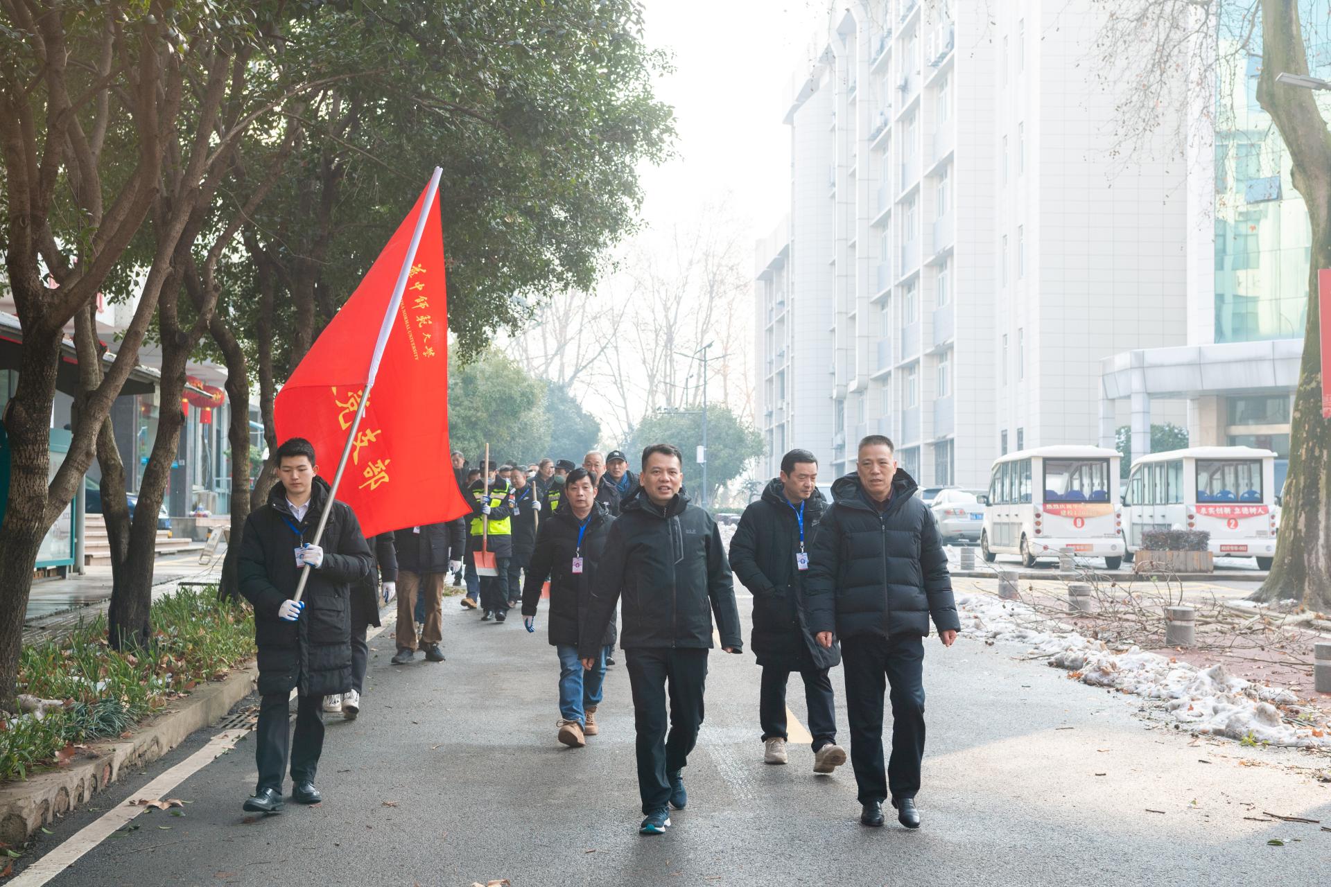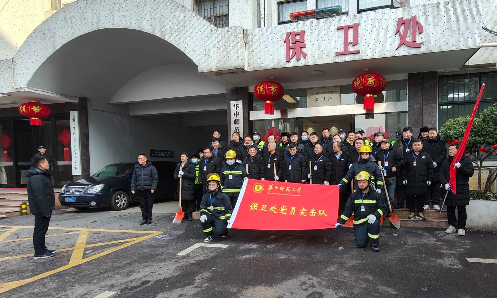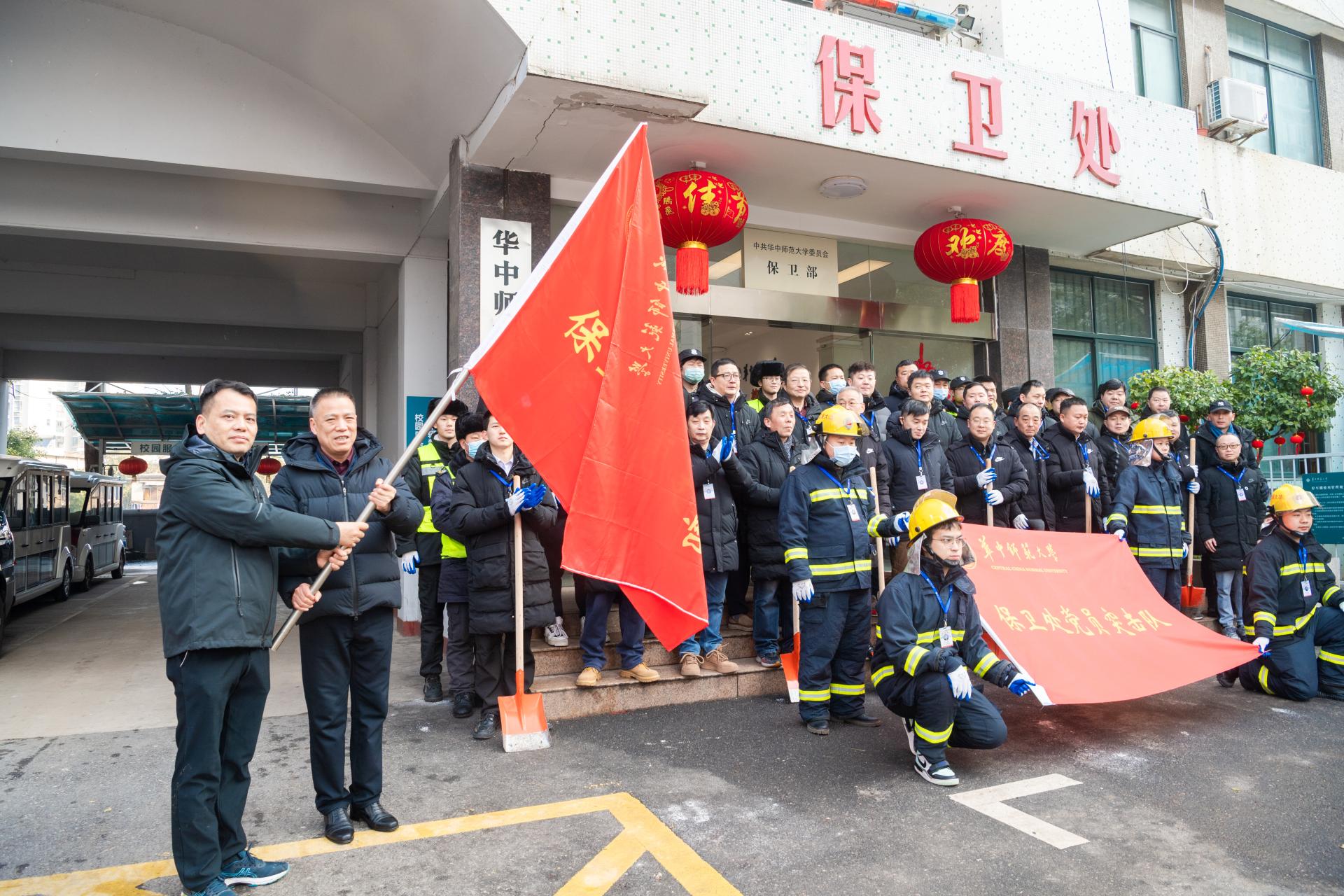 在除冰清碍行动开始之前,校党委副书记刘继文来保卫部(处)看望了除夕坚守一线的工作人员,关心询问了职工工作情况。同时,为保卫部(处)党支部这支一线党员突击队进行授旗,并对突击队党员提出希望。