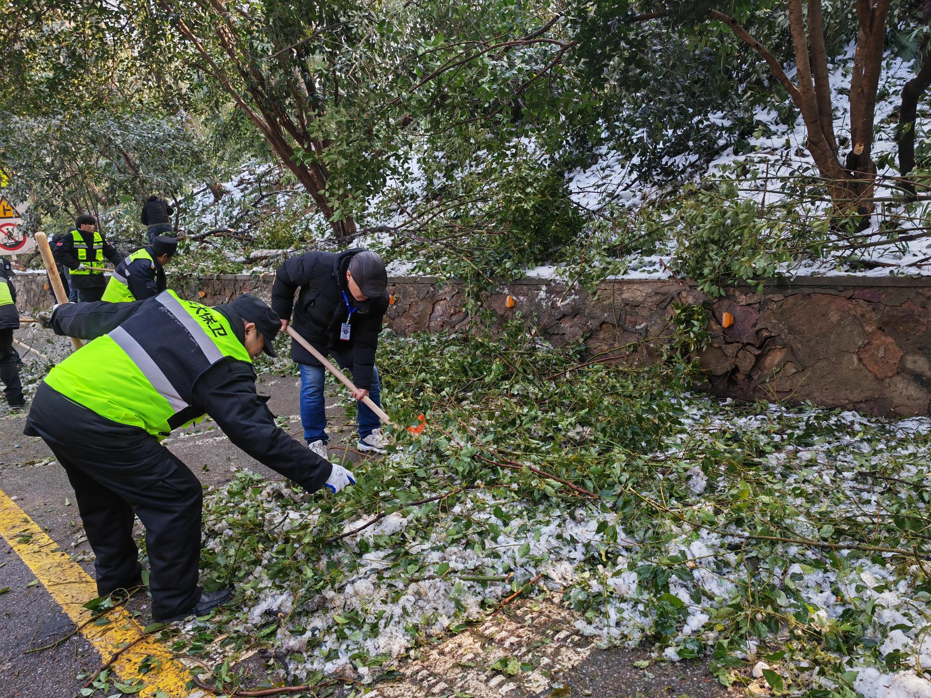 9:30,铁锹、电锯、手套、绳子、处突车等工具物资迅速到位,保卫部(处)突击队及志愿者共计50人在统一指挥下分成3组,对校园各主干道的树枝进行清理。