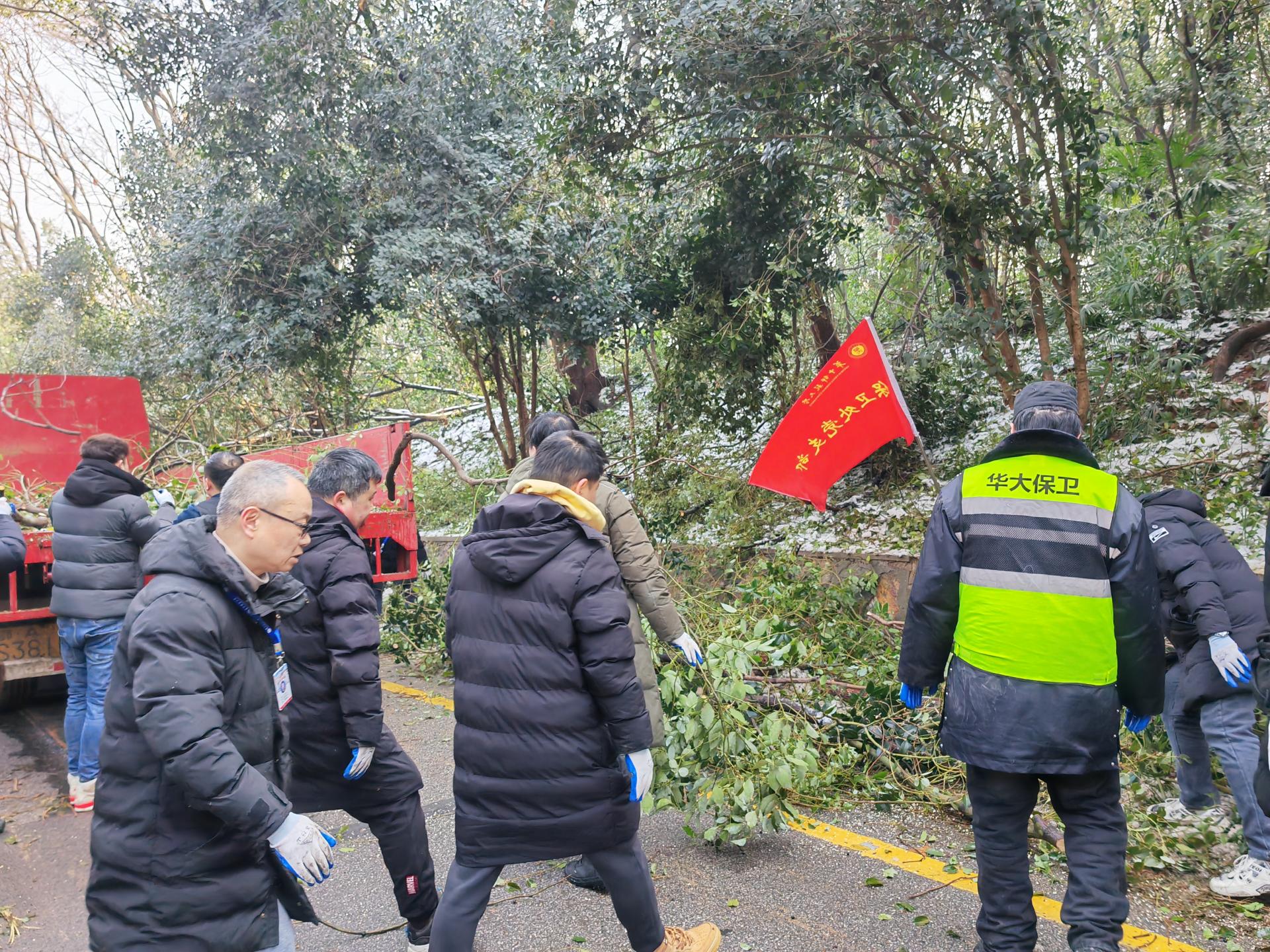 在奋战三个小时后,保卫处党员突击队及志愿者将环山北路两边被折断的树干树枝全部清理完成,并竭力协助兄弟单位完成相关任务。
