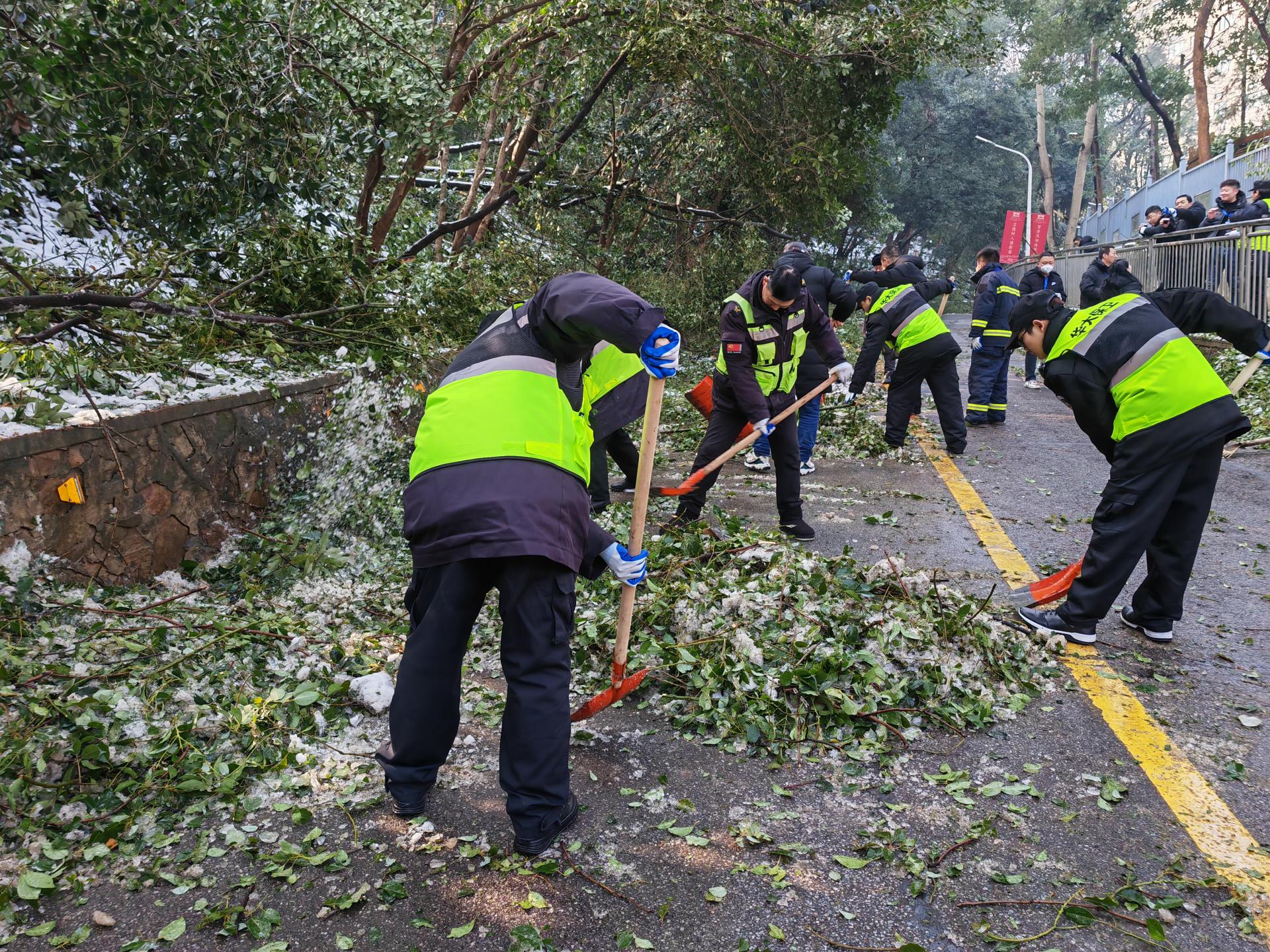 受前期冻雨暴雪天气影响,校园有大量被积雪压垮折断的树干树枝需要清理。2月9日上午9:00,保卫部(处)党支部开展“除夕我在岗,守护不打烊”支部特色活动,号召在汉党员及志愿者迅速集合,整装待发,排除隐患,抢通道路,确保师生居民出行平安。