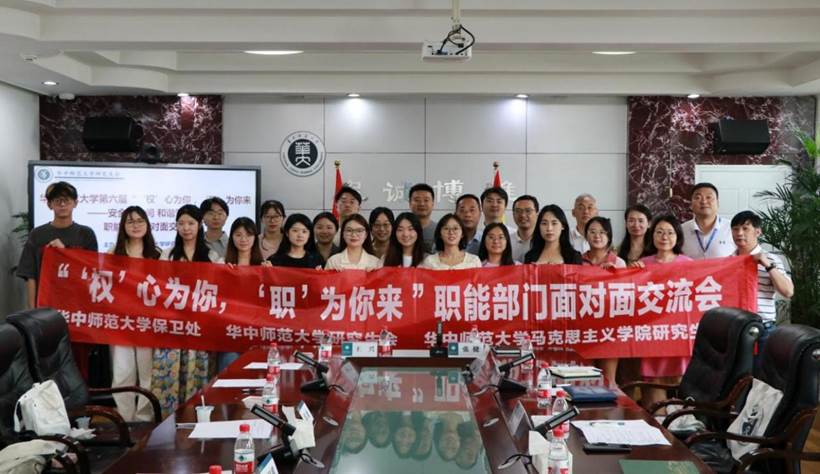 马克思主义学院讯(通讯员 候悦;摄影 谢宇) 6月14日上午11点,由华中师范大学研究生会主办、马克思主义学院承办的华中师范大学第六届“‘权’心为你,‘职’为你来—安全系心间 和谐筑校园”职能部门面对面交流会在我校保卫处三楼会议室顺利进行,保卫处副处长李丹、副处长柳亚涛、办公室主任高珊、校园服务车管理办公室主任艾晏东、校园秩序综合管理中心主任乔朝阳、副主任汤勇、南湖校区综合管理办公室主任张健、“情指行”中心主任李平频、校园治安综合管理中心副主任王兴出席本次活动,各学院学生代表积极参加。活动由马克思主义学院研究生会郭昊霆主持。