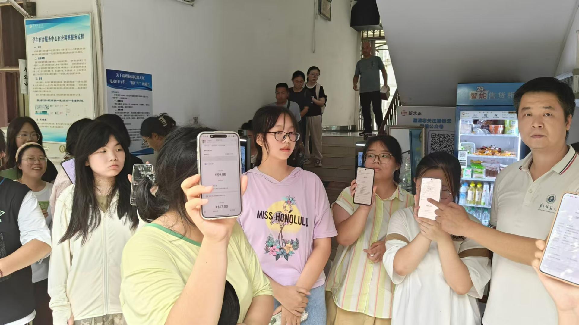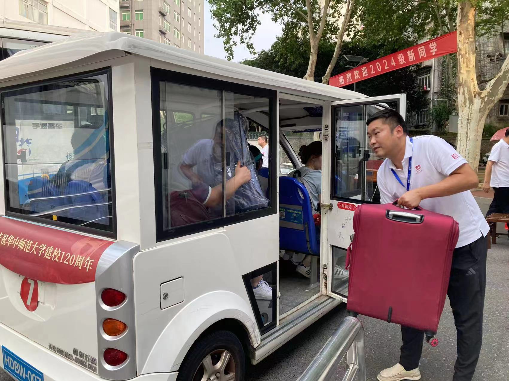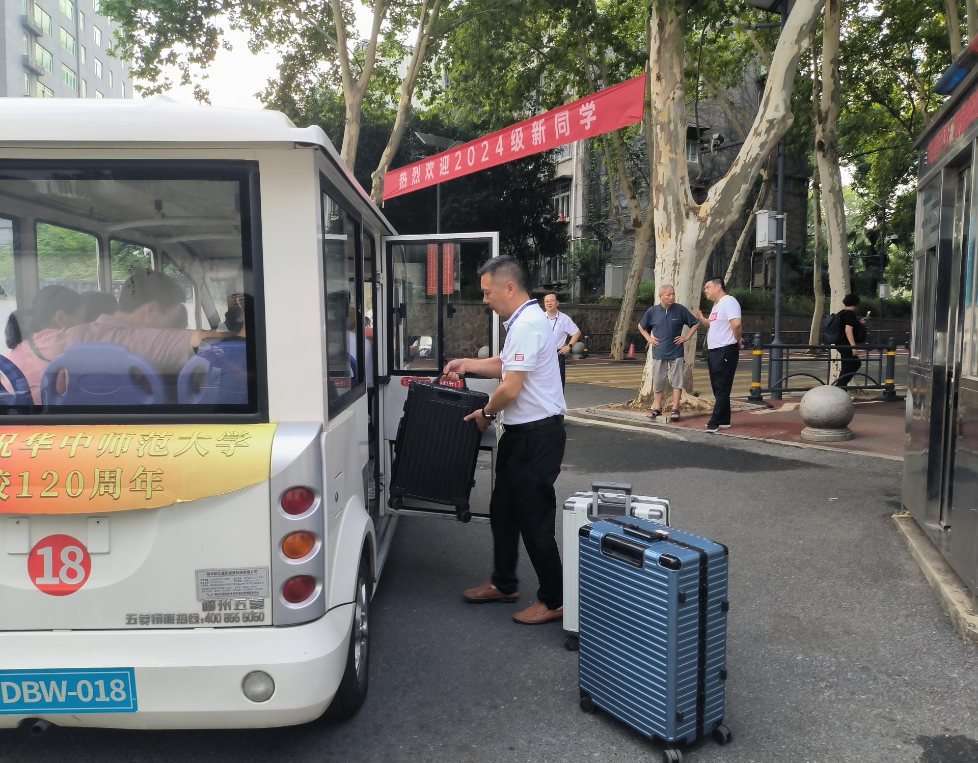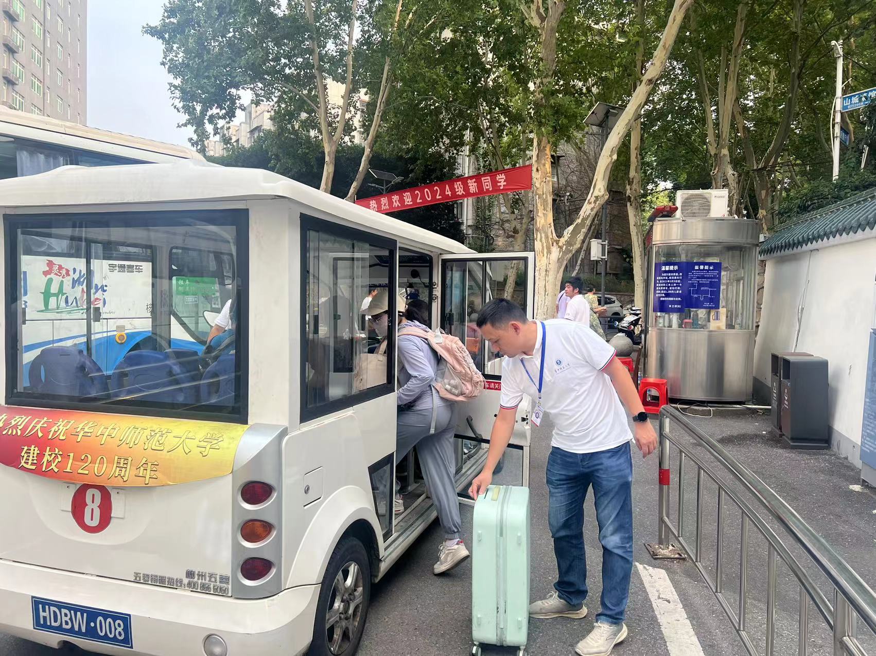 新生及家长们凭借录取通知书入校报到,免费乘坐校园服务车
