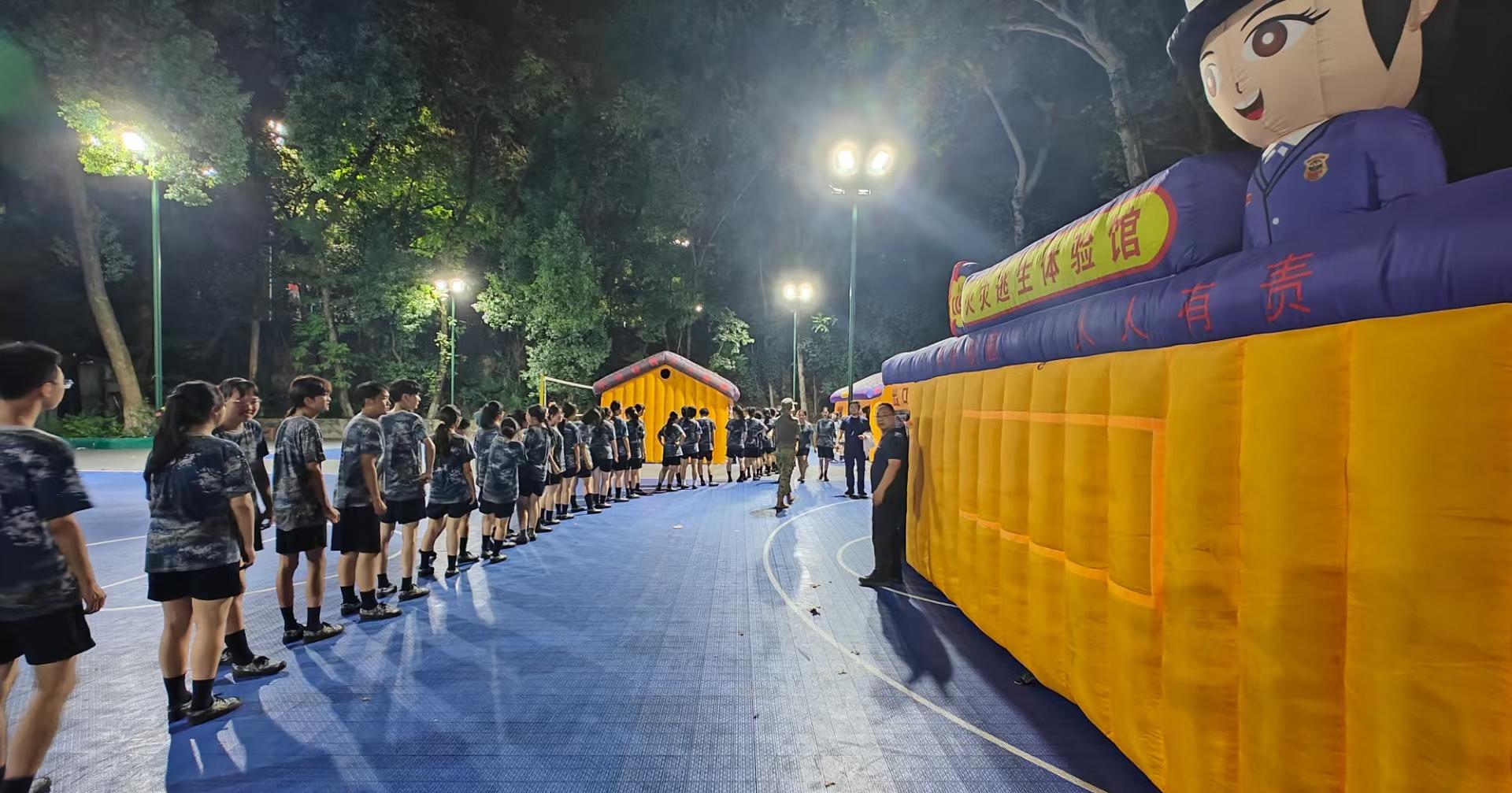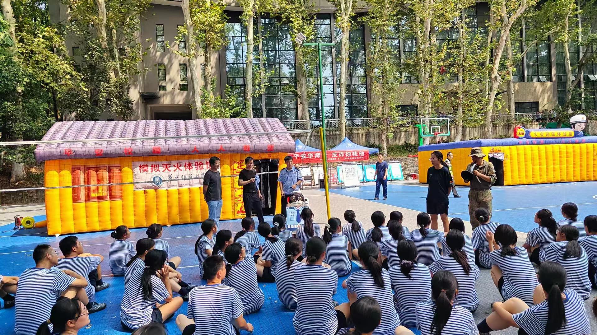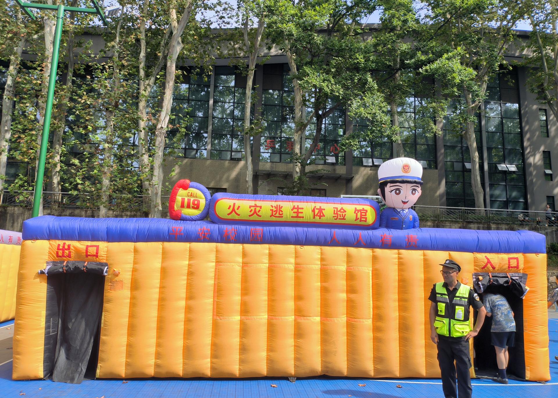 在军训场地旁,共搭建了4个充气式消防“体验馆”,分别用于模拟烟雾逃生和模拟灭火。军训间隙,保卫部(处)工作人员耐心为同学们讲解防护装备、灭火器材、救生器材等使用方法和技巧,并组织同学们有序入馆体验。