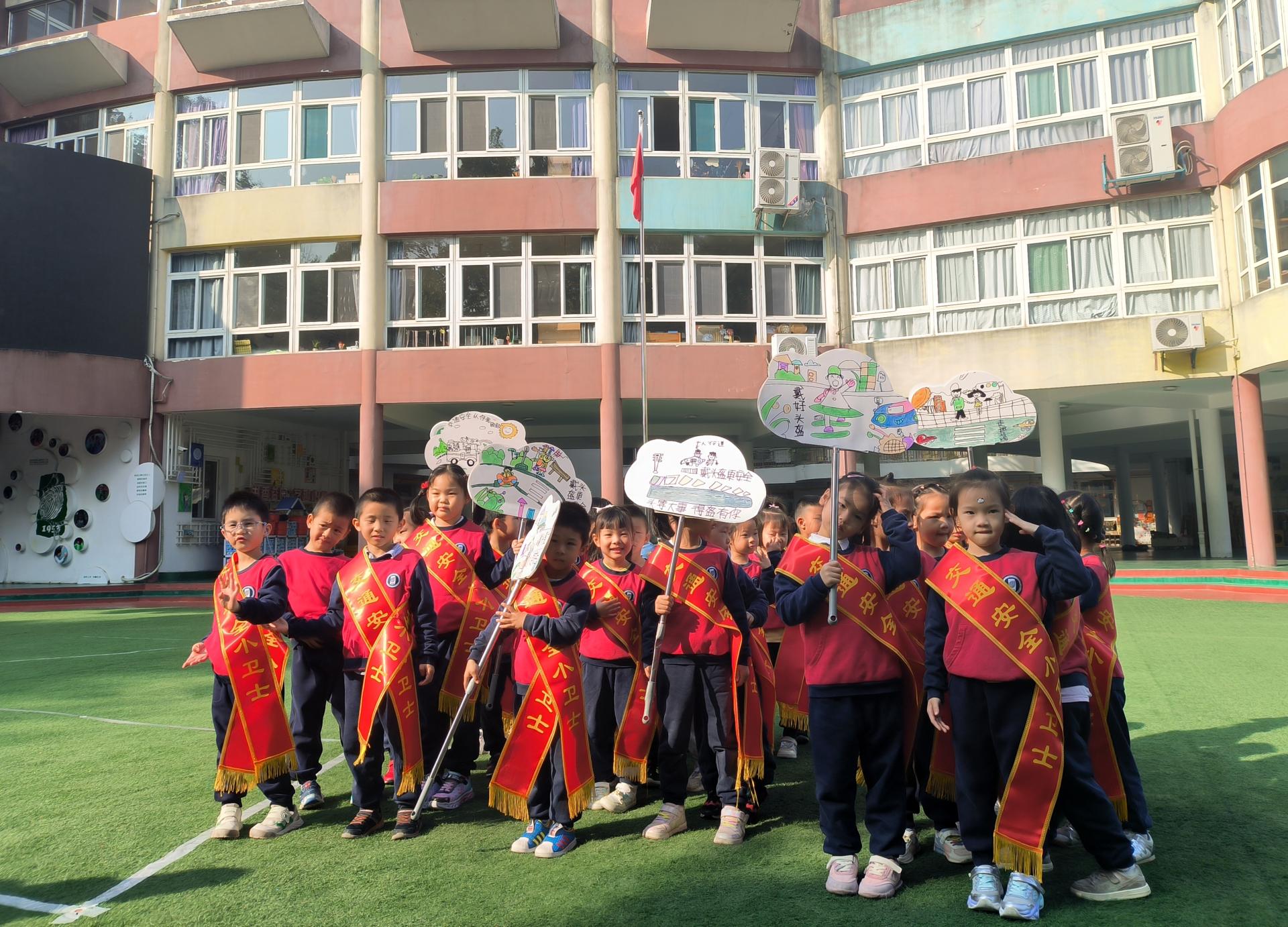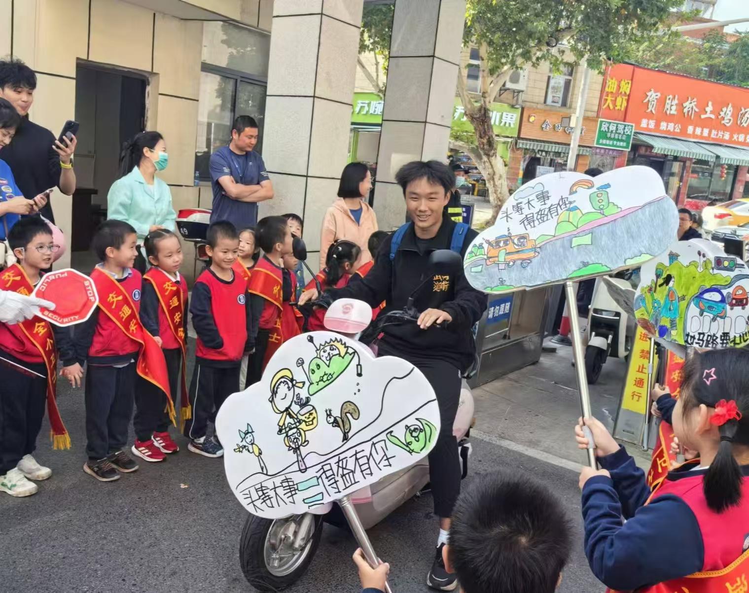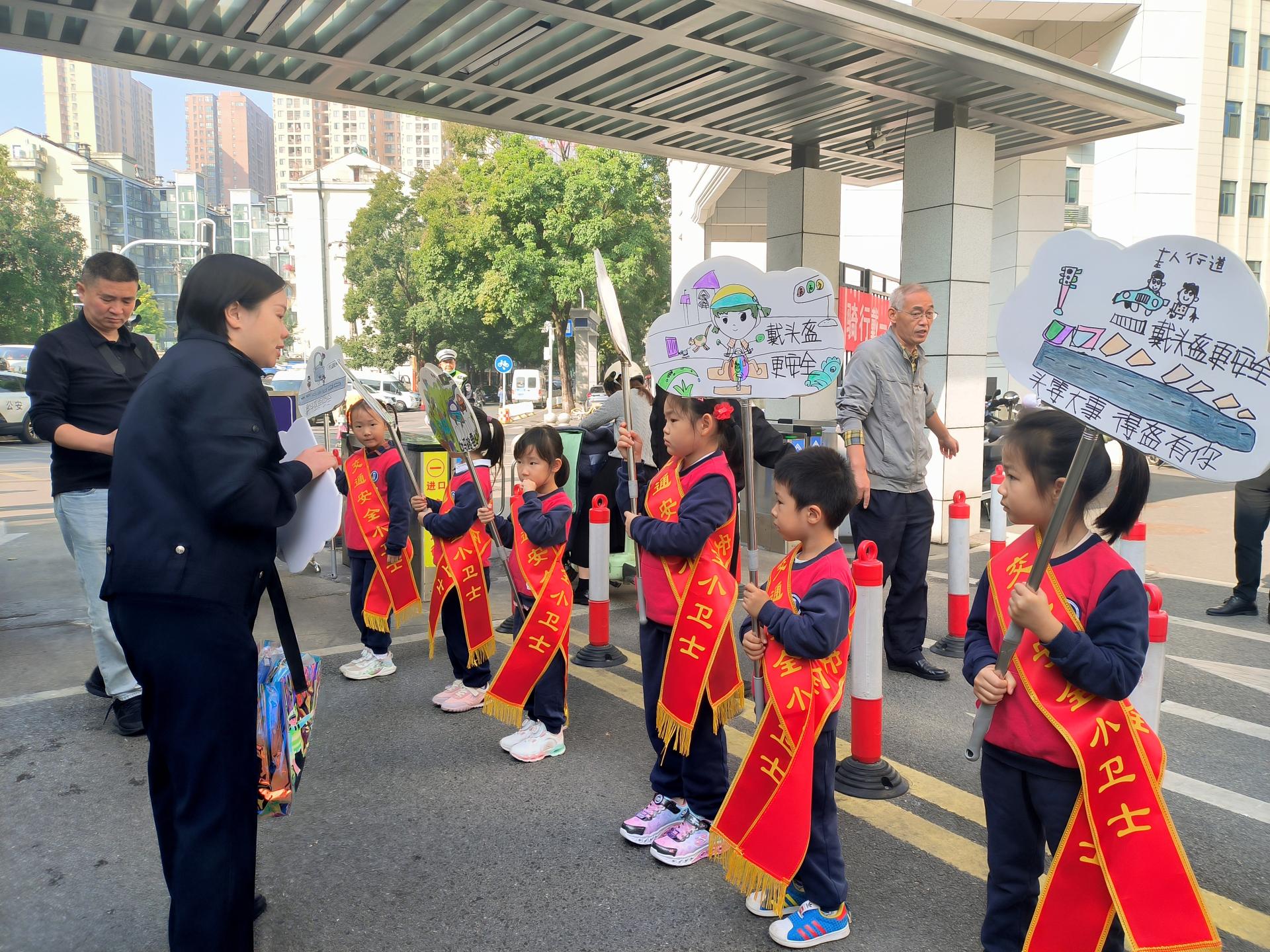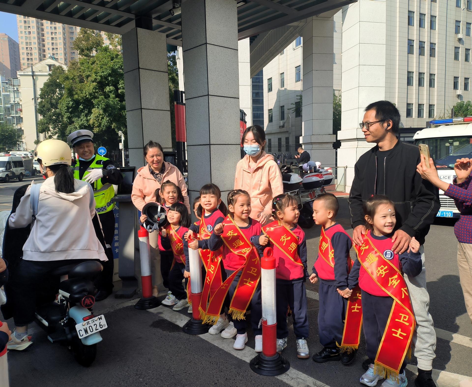 “萌娃交警队”由来自华师附属幼儿园的36名小朋友组成,他们秩序井然,装备齐全,身披印有“交通安全小卫士”字样的红绶带,手持童趣满满、创意十足的手绘提示牌,俨然一副“小交警”模样。