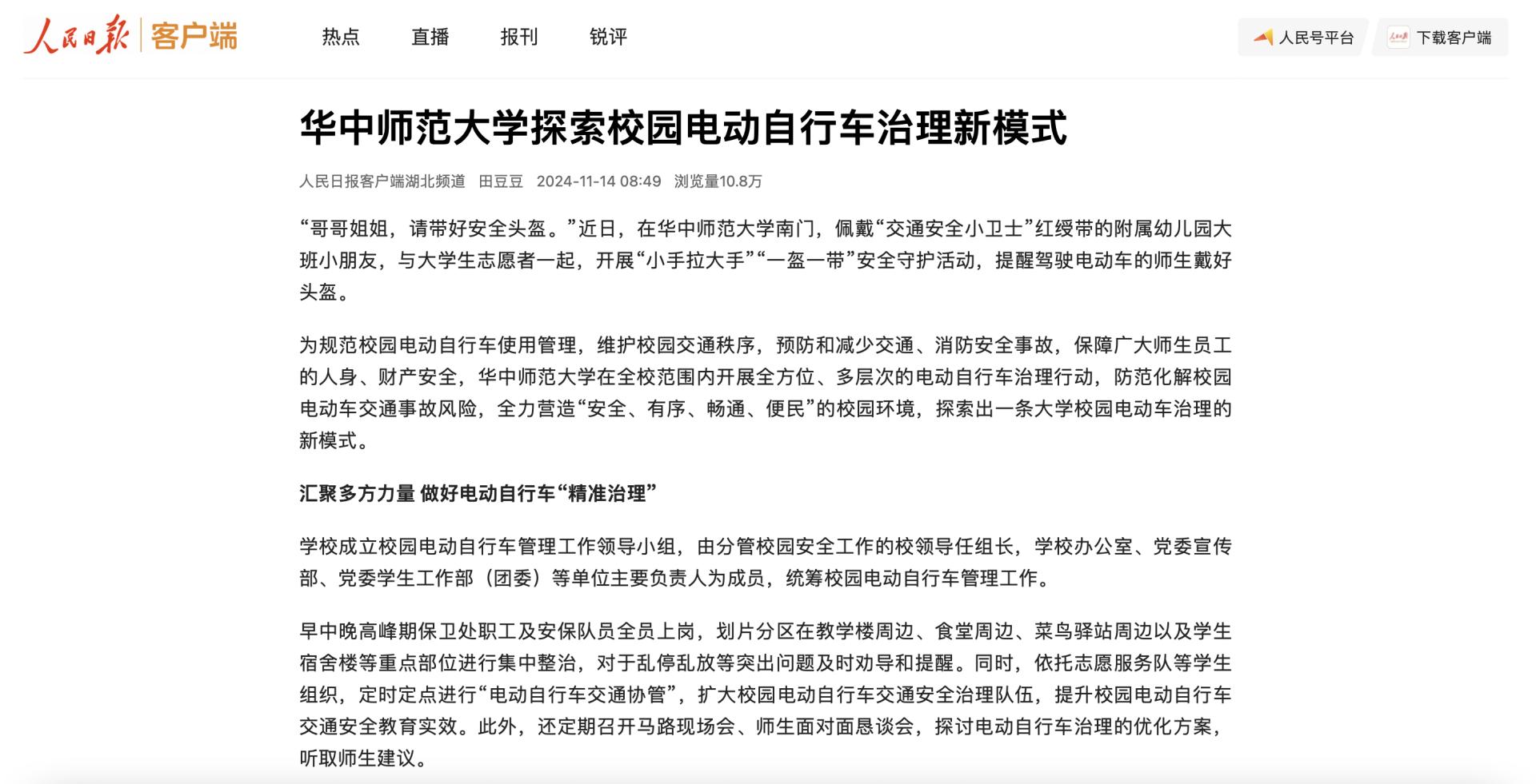 为规范校园电动自行车使用管理,维护校园交通秩序,预防和减少交通、消防安全事故,保障广大师生员工的人身、财产安全,华中师范大学在全校范围内开展全方位、多层次的电动自行车治理行动,防范化解校园电动车交通事故风险,全力营造“安全、有序、畅通、便民”的校园环境,探索出一条大学校园电动车治理的新模式。