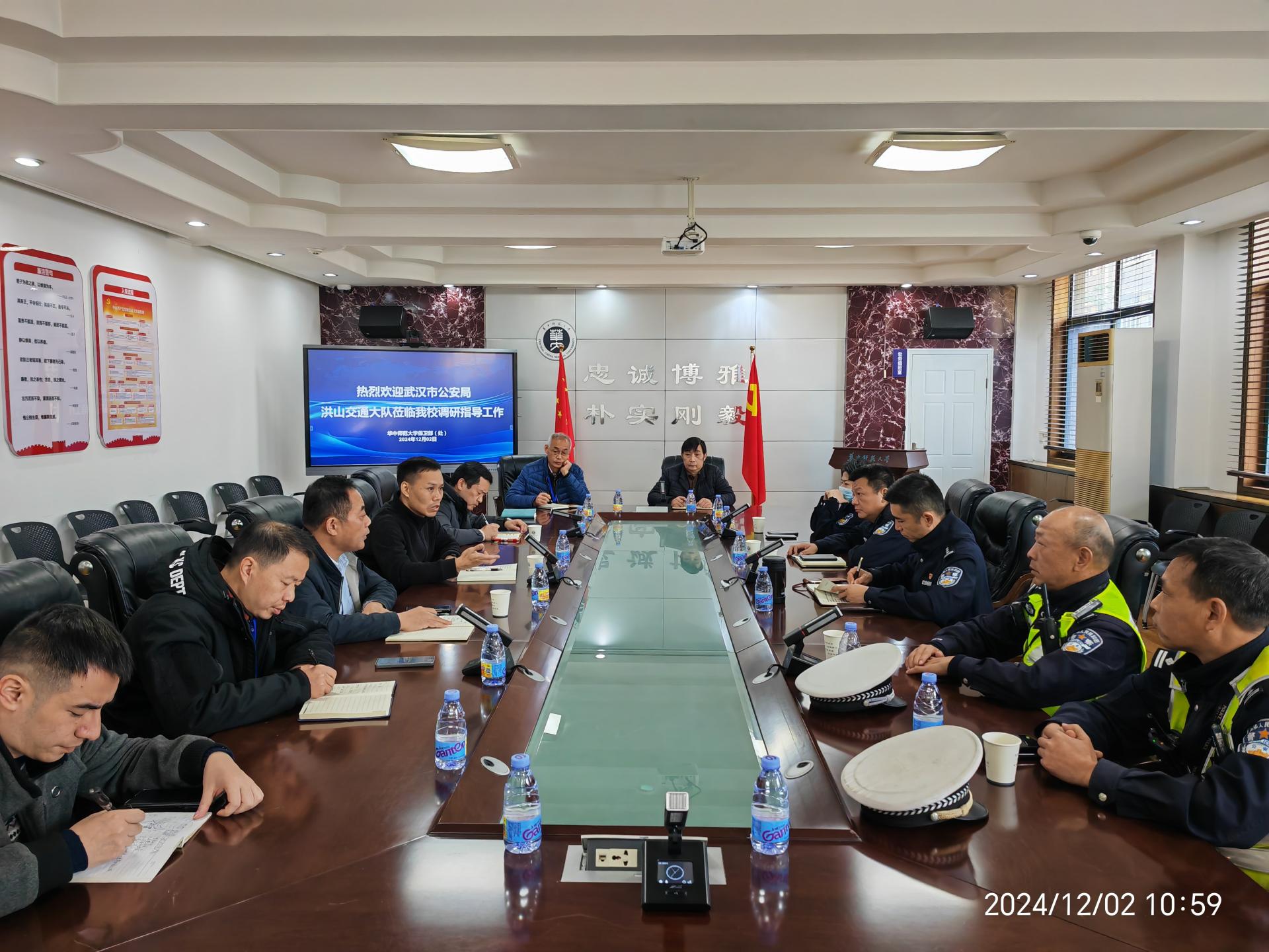 2024年12月2日,洪山公安分局副局长、洪山交通大队大队长顾宇磊一行莅临我校调研指导工作,保卫处处长王军、副处长李丹、副处长柳亚涛及中心主任参与座谈交流。
