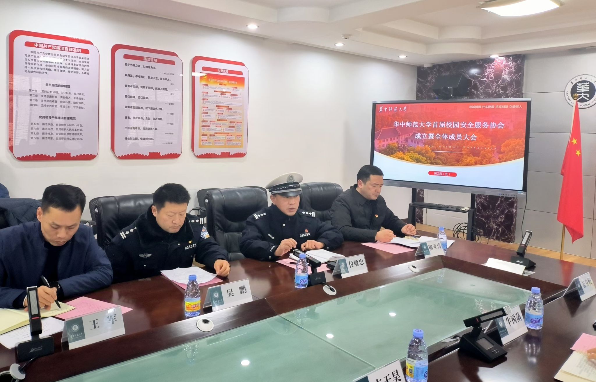 (通讯员 史玉聪 段宇杰)12月25日下午,华中师范大学首届校园安全服务协会成立暨全体成员大会在我校保卫处三楼会议室顺利召开。洪山区马房山派出所所长吴鹏、洪山区消防救援大队教导员范伟、洪山区交通大队二中队队长付敬忠、华中师范大学团委书记苏晓刚、华中师范大学党委学工部副部长李宪玲、保卫处处领导、保卫处各办公室负责人及社团指导老师参加会议。华中师范大学首届校园安全服务协会全体成员参加会议,会议由保卫处副处长柳亚涛主持。