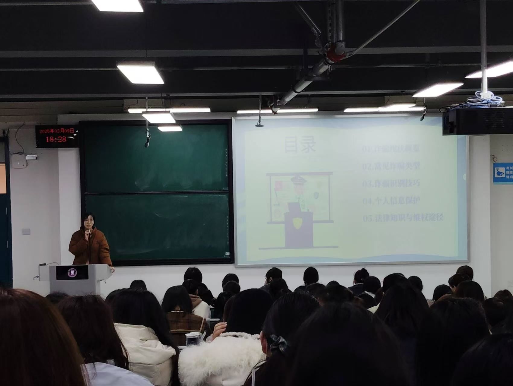 校园安全服务协会讯 (通讯员于雅洁、胡蝶)2025年3月9日晚,华中师范大学校园安全服务协会在保卫部的指导下,组织开展反诈骗系列宣传教育活动,联合文学院在八号楼8210教室开展反诈宣讲。活动以“警惕诈骗陷阱,守护财产安全”为主题,旨在通过知识普及与案例剖析,提升大学生防诈意识,夯实校园安全基础。校园安全服务协会指导老师史玉聪、会长潘诗薇及部分协会成员参加活动,文学院2024级100余名学生到场学习。
