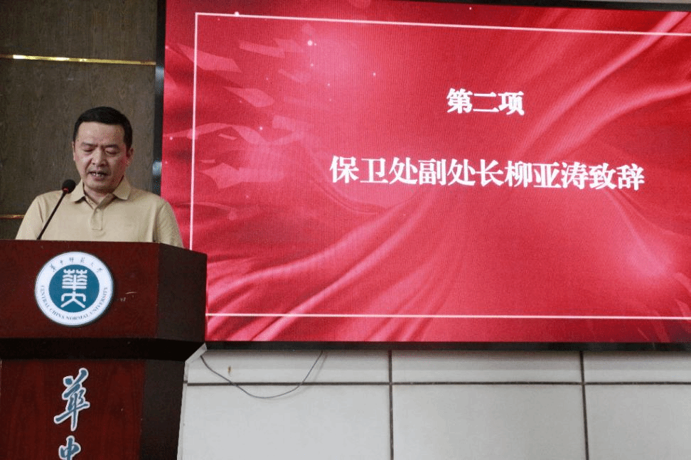 典礼上,首先播放了华中师范大学电动自行车治理宣传片和警示视频。随后,保卫处副处长柳亚涛发表致辞,阐述了开展电动自行车专项治理的必要性,包括保障安全、维护校园秩序以及育人环境所需,并介绍了举办“21 天零违章”挑战赛的目的在于正向引导学生自觉遵守规则,通过标杆示范作用营造良好氛围。他还向获奖者表示祝贺与感谢,强调治理是长期任务,希望获奖者继续发挥示范作用。