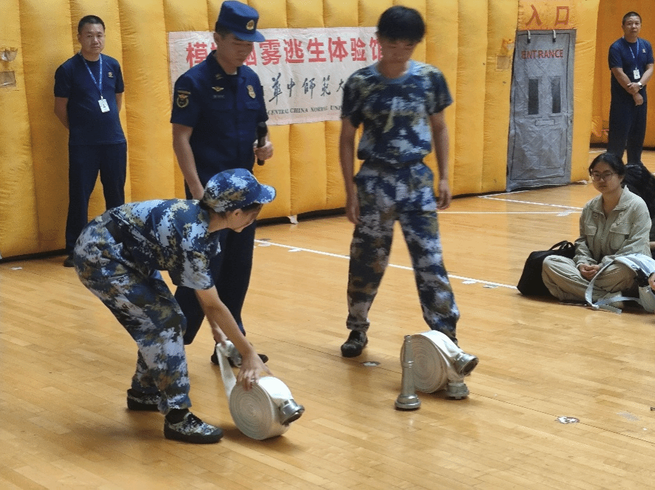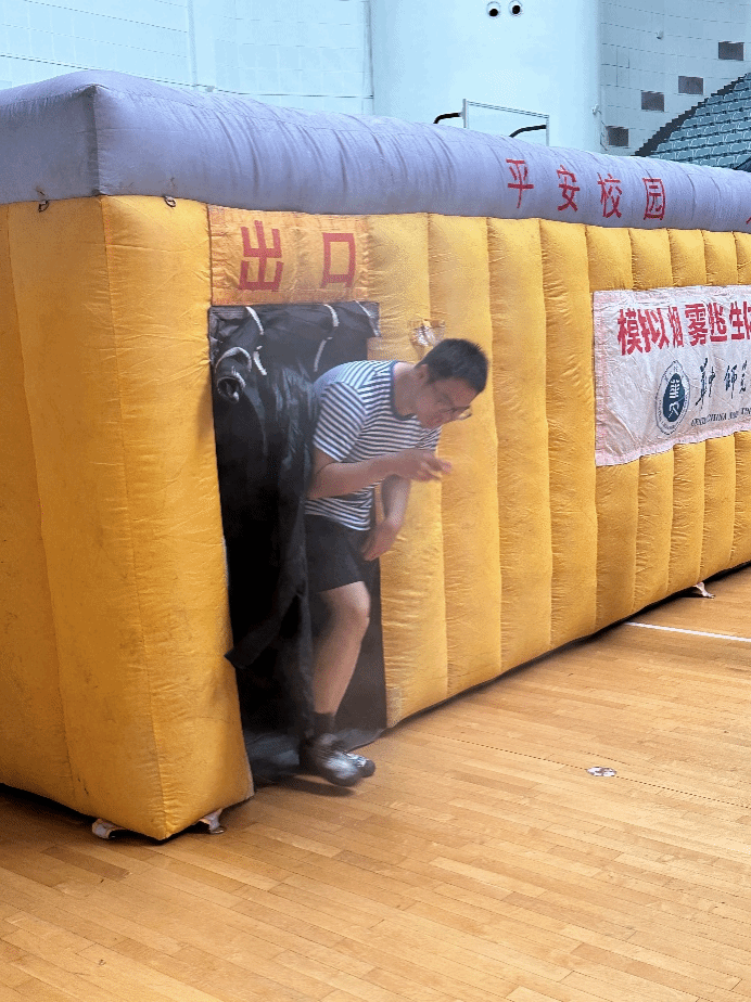 随后,在保卫处工作人员的引导下,同学们按照“低姿、捂口鼻、沿墙行”的逃生要领,有序进入模拟烟雾逃生体验馆,沉浸式体验了灭火处置的全过程。通过亲身体验,大家切身感受到火场环境的危险性,掌握了正确的逃生方法。