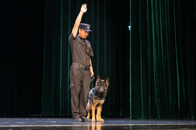 随后,缉毒犬登台亮相。在训导员的指挥下,分别完成了各项指令动作和模拟“搜毒”任务,引得现场喝彩不断。