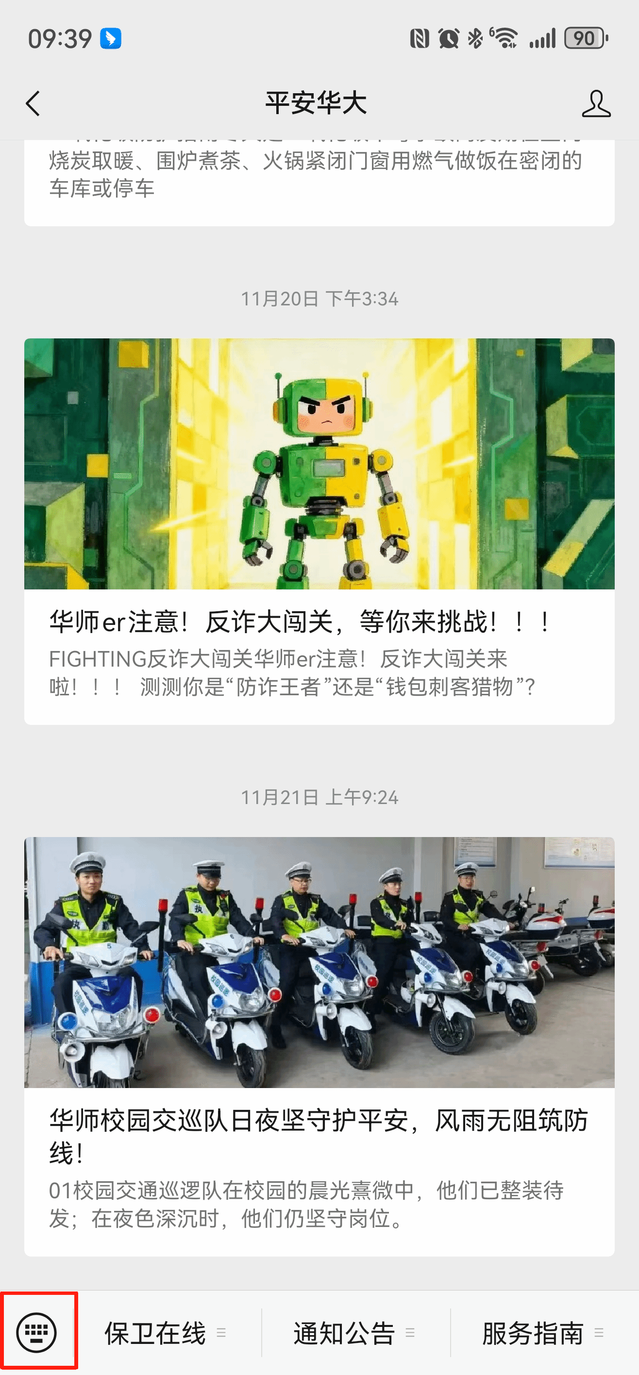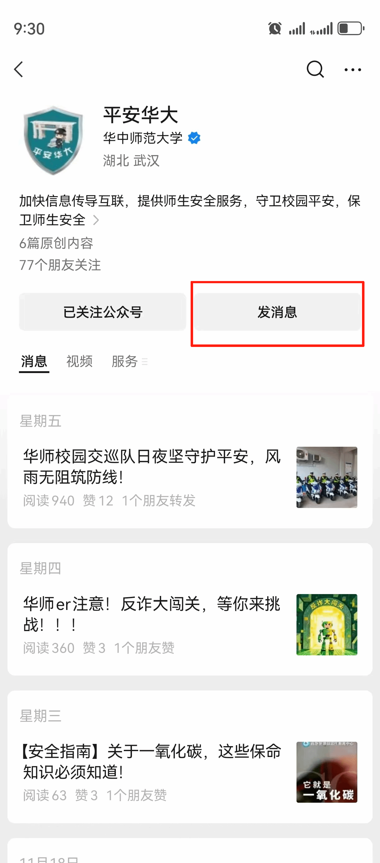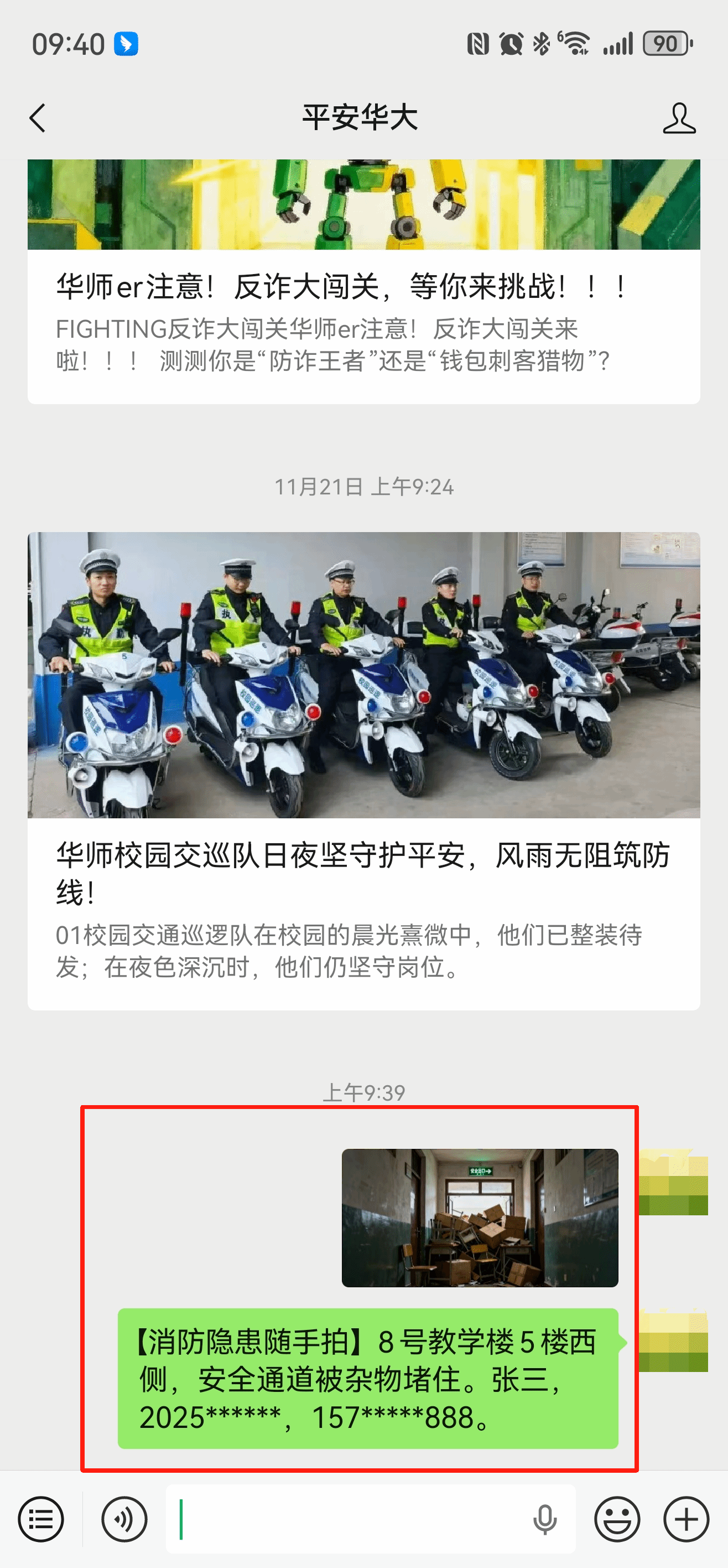 2025年11月26日至12月5日,在保卫处官方微信公众号“平安华大”的留言框中,提交您在校园发现的消防隐患,并上传清晰的隐患照片+文字留言注明具体地点及隐患情况。