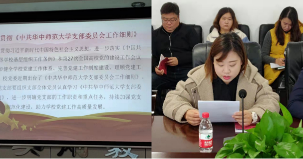 会议首先由支部书记王东爽同志向大家传达了本次主题党日活动的通知。他说道,每月一次的党日活动是为了让同志们对党史教育及党内学习有着更好的推动力。我们应当认真领悟其中精神,并将学习的心得用在工作之中。接着,由宣传委员刘亚瑾同志带领大家学习了《中共华中师范大学支部委员会工作细则》。她详细的领学了《细则》中涉及到党支部、委员职责的内容。并说道,我们通过学习《细则》,要进一步清楚自己工作的职责与重点任务,持续加强党支部工作标准化、规范化建设,助力学校党建工作高质量发展。