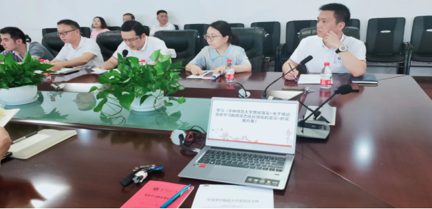 会议共四项议程。首先,全体党员庄重的重温了入党誓词。第二项在7.1到来之际大家一起重温了习近平总书记在庆祝中国共产党成立100周年大会上的重要讲话精神。会议第三项,由柳亚涛和刘亚瑾同志分别向大家传达领学《华中师范大学贯彻落实<关于推动党史学习教育常态化长效化的意见>的实施方案》和《关于开展党员干部下基层察民情解民忧暖民心实践活动的实施方案》。同时,将两份《实施方案》内容与工作实际相结合,向大家汇报了近期党建工作中部分内容的进程。会议第四项,由宣传委员刘亚瑾向大家通过一张图解读了湖北省第十二次党代会报告内容。党员同志们都认真聆听并做好会议记录。