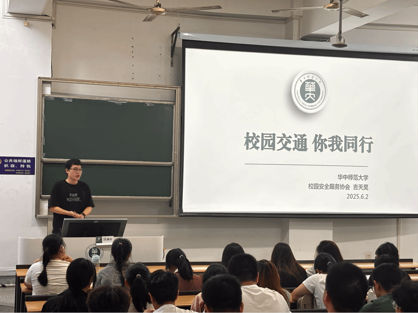 校园安全服务协会讯(通讯员 刘灏然)6月2日下午,华中师范大学保卫处、校园安全服务协会联合数学与统计学学院,于九号楼9301教室开展“校园交通,你我同行”主题宣讲活动。本次活动由协会吉天昊同学主讲,数学与统计学学院2024级200余名学生参与学习。