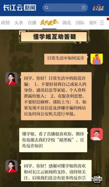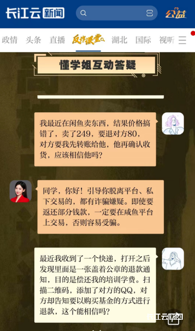 此外,由长江云新闻客户端开发的《反诈课堂》智能应用程序还开设了“湖北高校沉浸式反诈课堂”“懂学姐教反诈”“反诈脱口秀”“湖北高校反诈宣传联盟”“反诈小剧场”等多个应用版块。仅2023年10月至12月,“懂学姐教反诈”陆续收到各高校学生反映的问题1211条,83%的问题得到有效解决和答复。团队深挖后台大数据,形成相关报告供反诈中心和公安机关作为决策参考。