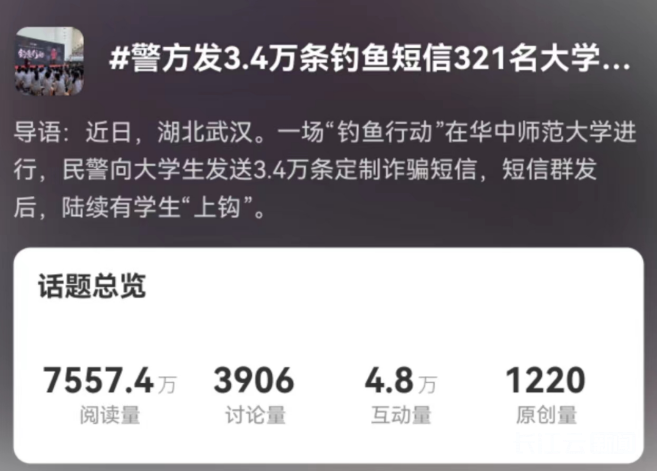 三个月前,一场“钓鱼行动”在湖北武汉华中师范大学进行,民警向大学生们发送了3.4万条短信,累积有321名大学生上当,这一新闻成为了当时的全网热搜。(新闻回顾>>“钓鱼”行动收网!“上钩”者中研究生超六成)