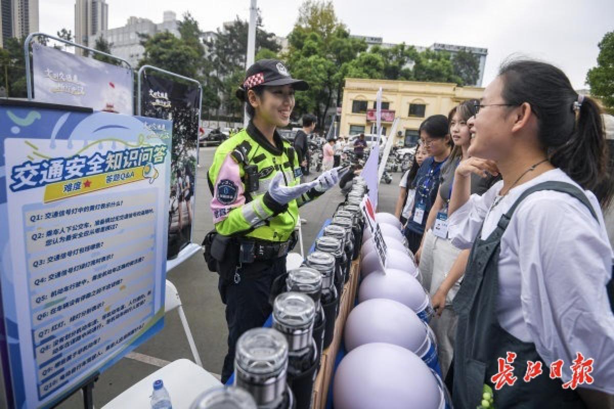 当天上午9时许,武汉交警在华中师范大学东区篮球场上办了一场“文明交通 畅行武汉”交通安全知识挑战赛活动。“成年人驾驶电动自行车,在确保安全的前提下,在市区道路上,可以载一名几岁以下的未成年人?”英姿飒爽的汉警快骑小姐姐朝信息管理系大三女生小曾发问。小曾成竹在胸:“12岁”。“恭喜你!答对了!奖品是一个交通安全主题盲盒!”答对了题的小曾笑眯眯从汉警快骑女队员手中领走一个奖品笔记本。